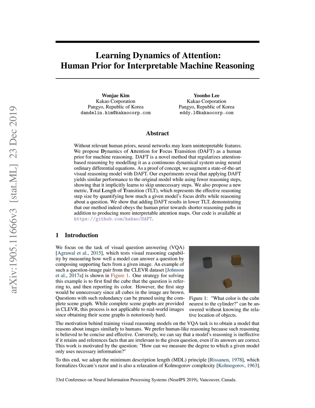 Without relevant human priors, neural networks may learn uninterpretable features. We propose Dynamics of Attention for Focus Transition (DAFT) as a human prior for machine reasoning. DAFT is a novel method that regularizes attention-based reasoning by modelling it as a continuous dynamical system using neural ordinary differential equations. As a proof of concept, we augment a state-of-the-art visual reasoning model with DAFT. Our experiments reveal that applying DAFT yields similar performance to the original model while using fewer reasoning steps, showing that it implicitly learns to skip unnecessary steps. We also propose a new metric, Total Length of Transition (TLT), which represents the effective reasoning step size by quantifying how much a given model's focus drifts while reasoning about a question. We show that adding DAFT results in lower TLT, demonstrating that our method indeed obeys the human prior towards shorter reasoning paths in addition to producing more interpretable attention maps.