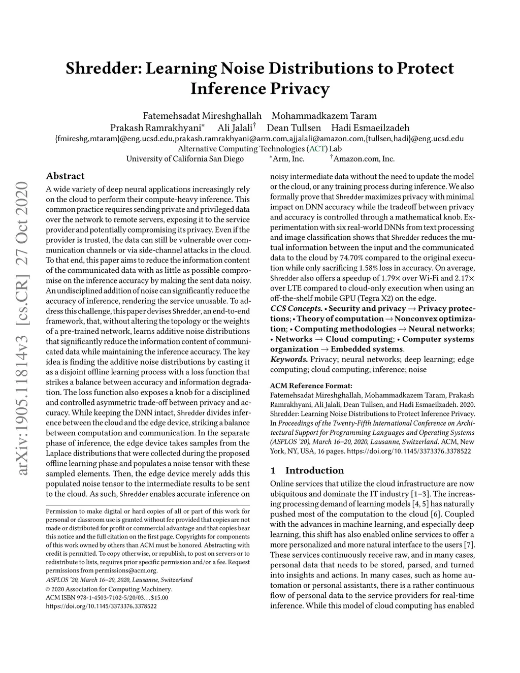 A wide variety of deep neural applications increasingly rely on the cloud to perform their compute-heavy inference. This common practice requires sending private and privileged data over the network to remote servers, exposing it to the service provider and potentially compromising its privacy. Even if the provider is trusted, the data can still be vulnerable over communication channels or via side-channel attacks in the cloud. To that end, this paper aims to reduce the information content of the communicated data with as little as possible compromise on the inference accuracy by making the sent data noisy. An undisciplined addition of noise can significantly reduce the accuracy of inference, rendering the service unusable. To address this challenge, this paper devises Shredder, an end-to-end framework, that, without altering the topology or the weights of a pre-trained network, learns additive noise distributions that significantly reduce the information content of communicated data while maintaining the inference accuracy. The key idea is finding the additive noise distributions by casting it as a disjoint offline learning process with a loss function that strikes a balance between accuracy and information degradation. The loss function also exposes a knob for a disciplined and controlled asymmetric trade-off between privacy and accuracy. Experimentation with six real-world DNNs from text processing and image classification shows that Shredder reduces the mutual information between the input and the communicated data to the cloud by 74.70% compared to the original execution while only sacrificing 1.58% loss in accuracy. On average, Shredder also offers a speedup of 1.79x over Wi-Fi and 2.17x over LTE compared to cloud-only execution when using an off-the-shelf mobile GPU (Tegra X2) on the edge.