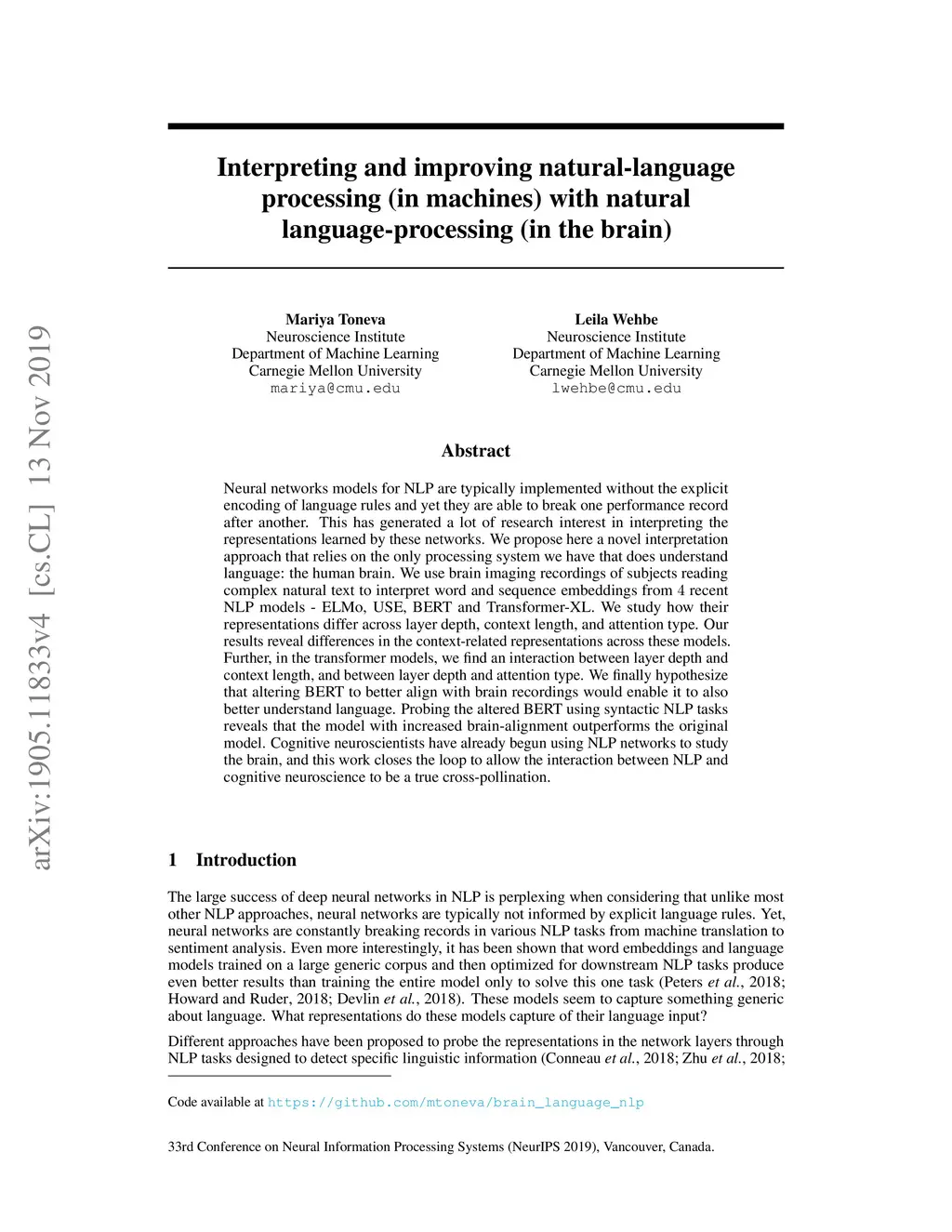 Neural networks models for NLP are typically implemented without the explicit encoding of language rules and yet they are able to break one performance record after another. This has generated a lot of research interest in interpreting the representations learned by these networks. We propose here a novel interpretation approach that relies on the only processing system we have that does understand language: the human brain. We use brain imaging recordings of subjects reading complex natural text to interpret word and sequence embeddings from 4 recent NLP models - ELMo, USE, BERT and Transformer-XL. We study how their representations differ across layer depth, context length, and attention type. Our results reveal differences in the context-related representations across these models. Further, in the transformer models, we find an interaction between layer depth and context length, and between layer depth and attention type. We finally hypothesize that altering BERT to better align with brain recordings would enable it to also better understand language. Probing the altered BERT using syntactic NLP tasks reveals that the model with increased brain-alignment outperforms the original model. Cognitive neuroscientists have already begun using NLP networks to study the brain, and this work closes the loop to allow the interaction between NLP and cognitive neuroscience to be a true cross-pollination.