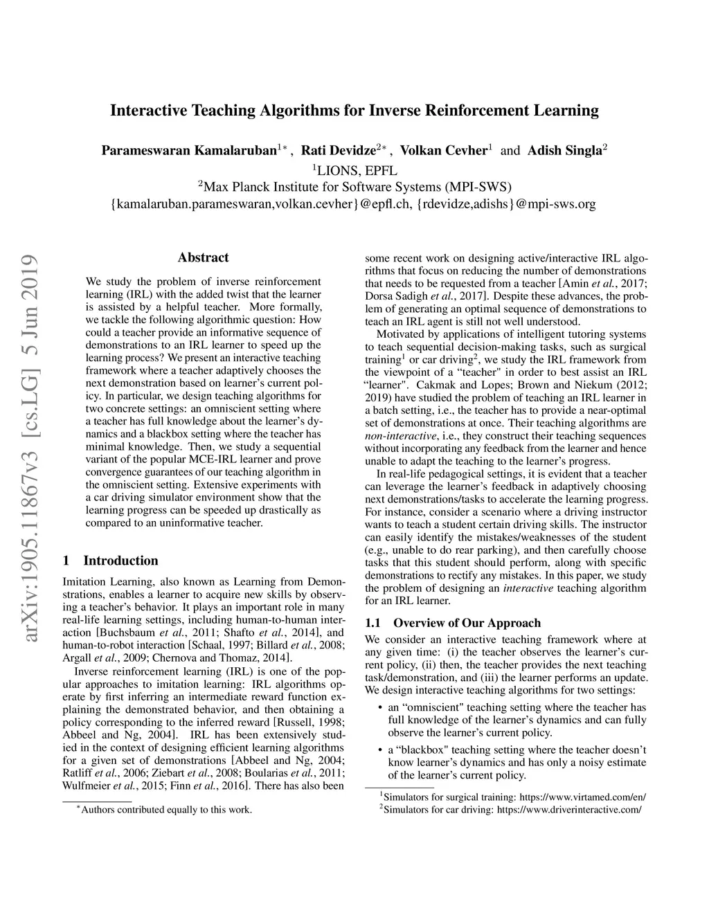 We study the problem of inverse reinforcement learning (IRL) with the added twist that the learner is assisted by a helpful teacher. More formally, we tackle the following algorithmic question: How could a teacher provide an informative sequence of demonstrations to an IRL learner to speed up the learning process? We present an interactive teaching framework where a teacher adaptively chooses the next demonstration based on learner's current policy. In particular, we design teaching algorithms for two concrete settings: an omniscient setting where a teacher has full knowledge about the learner's dynamics and a blackbox setting where the teacher has minimal knowledge. Then, we study a sequential variant of the popular MCE-IRL learner and prove convergence guarantees of our teaching algorithm in the omniscient setting. Extensive experiments with a car driving simulator environment show that the learning progress can be speeded up drastically as compared to an uninformative teacher.