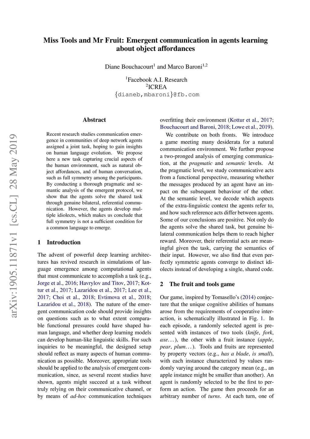 Miss Tools and Mr Fruit: Emergent communication in agents learning about