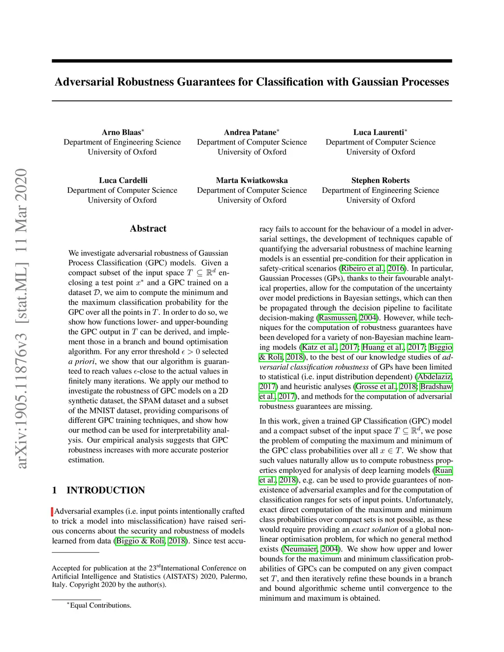 We investigate adversarial robustness of Gaussian Process Classification (GPC) models. Given a compact subset of the input space enclosing a test point and a GPC trained on a dataset , we aim to compute the minimum and the maximum classification probability for the GPC over all the points in . In order to do so, we show how functions lower- and upper-bounding the GPC output in can be derived, and implement those in a branch and bound optimisation algorithm. For any error threshold selected a priori, we show that our algorithm is guaranteed to reach values -close to the actual values in finitely many iterations. We apply our method to investigate the robustness of GPC models on a 2D synthetic dataset, the SPAM dataset and a subset of the MNIST dataset, providing comparisons of different GPC training techniques, and show how our method can be used for interpretability analysis. Our empirical analysis suggests that GPC robustness increases with more accurate posterior estimation.