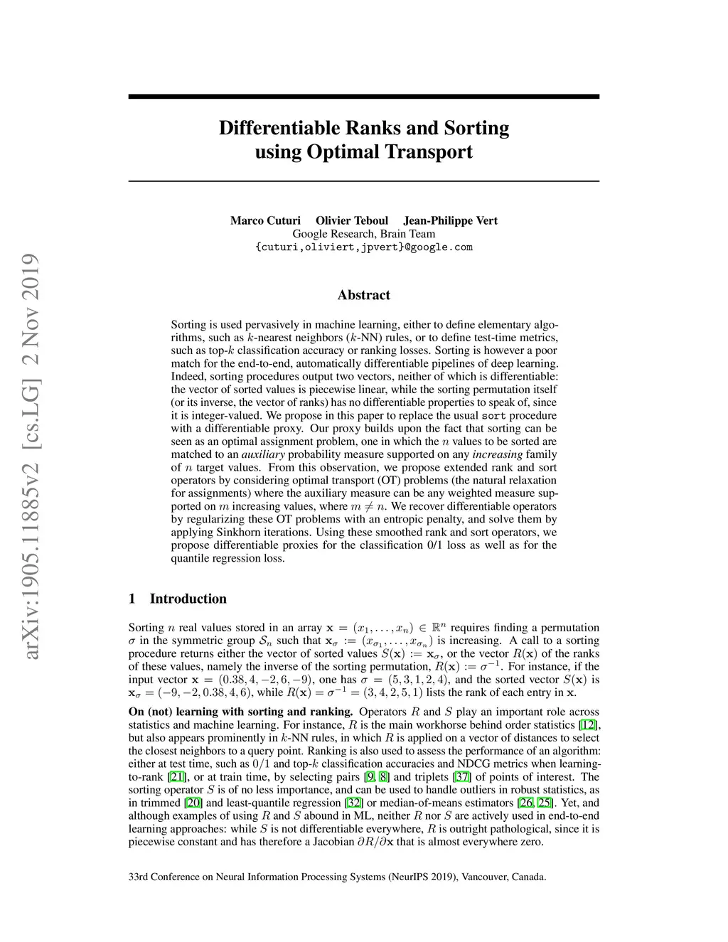 Sorting an array is a fundamental routine in machine learning, one that is used to compute rank-based statistics, cumulative distribution functions (CDFs), quantiles, or to select closest neighbors and labels. The sorting function is however piece-wise constant (the sorting permutation of a vector does not change if the entries of that vector are infinitesimally perturbed) and therefore has no gradient information to back-propagate. We propose a framework to sort elements that is algorithmically differentiable. We leverage the fact that sorting can be seen as a particular instance of the optimal transport (OT) problem on , from input values to a predefined array of sorted values (e.g. if the input array has elements). Building upon this link , we propose generalized CDFs and quantile operators by varying the size and weights of the target presorted array. Because this amounts to using the so-called Kantorovich formulation of OT, we call these quantities K-sorts, K-CDFs and K-quantiles. We recover differentiable algorithms by adding to the OT problem an entropic regularization, and approximate it using a few Sinkhorn iterations. We call these operators S-sorts, S-CDFs and S-quantiles, and use them in various learning settings: we benchmark them against the recently proposed neuralsort [Grover et al. 2019], propose applications to quantile regression and introduce differentiable formulations of the top-k accuracy that deliver state-of-the art performance.