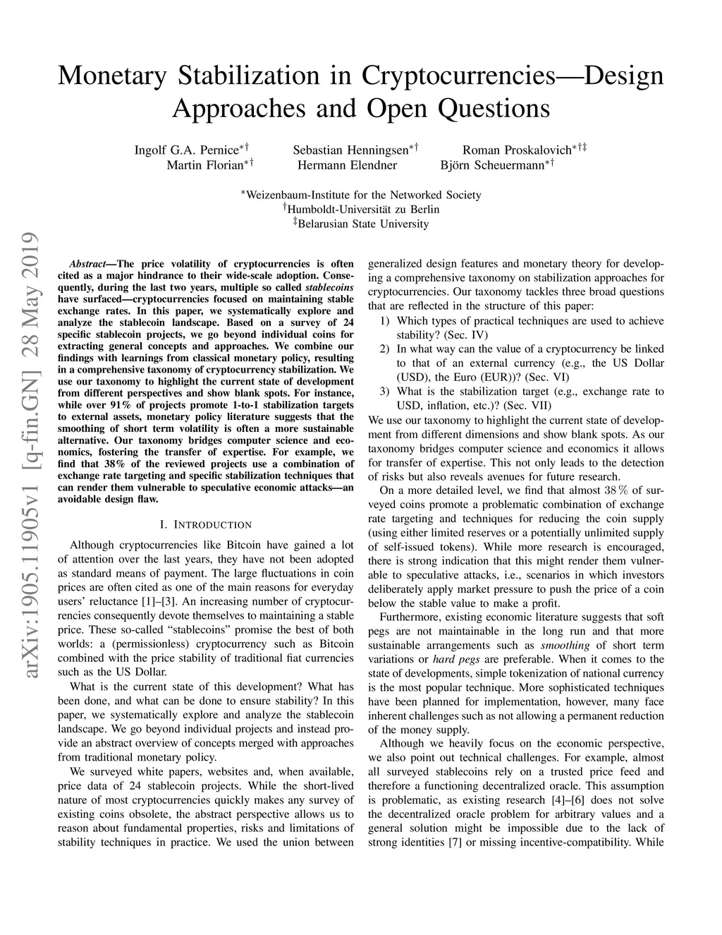 The price volatility of cryptocurrencies is often cited as a major hindrance to their wide-scale adoption. Consequently, during the last two years, multiple so called stablecoins have surfaced---cryptocurrencies focused on maintaining stable exchange rates. In this paper, we systematically explore and analyze the stablecoin landscape. Based on a survey of 24 specific stablecoin projects, we go beyond individual coins for extracting general concepts and approaches. We combine our findings with learnings from classical monetary policy, resulting in a comprehensive taxonomy of cryptocurrency stabilization. We use our taxonomy to highlight the current state of development from different perspectives and show blank spots. For instance, while over 91% of projects promote 1-to-1 stabilization targets to external assets, monetary policy literature suggests that the smoothing of short term volatility is often a more sustainable alternative. Our taxonomy bridges computer science and economics, fostering the transfer of expertise. For example, we find that 38% of the reviewed projects use a combination of exchange rate targeting and specific stabilization techniques that can render them vulnerable to speculative economic attacks - an avoidable design flaw.