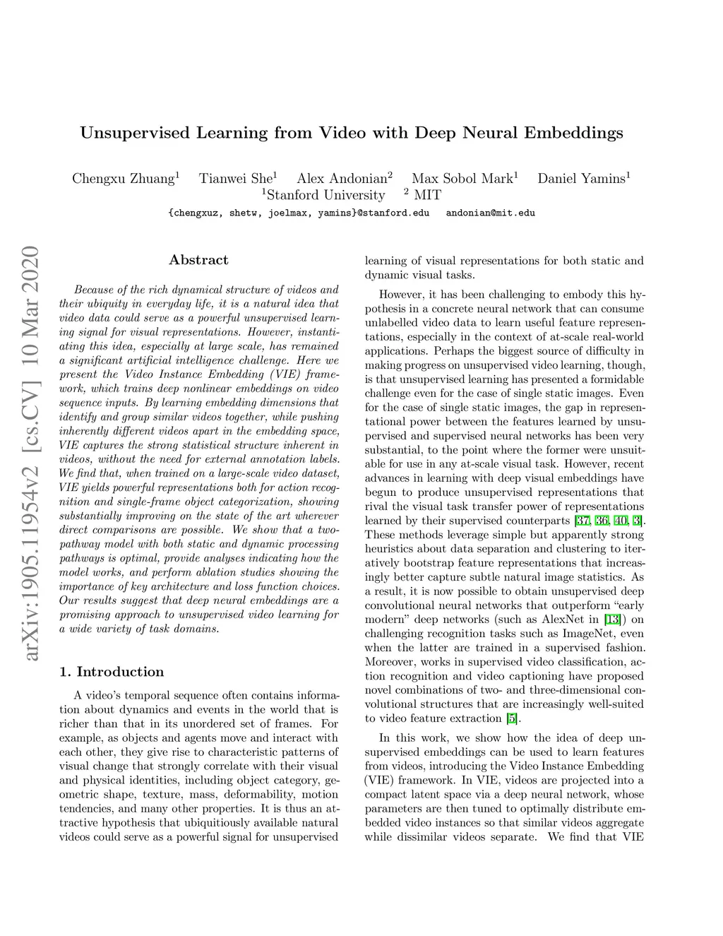 Because of the rich dynamical structure of videos and their ubiquity in everyday life, it is a natural idea that video data could serve as a powerful unsupervised learning signal for training visual representations in deep neural networks. However, instantiating this idea, especially at large scale, has remained a significant artificial intelligence challenge. Here we present the Video Instance Embedding (VIE) framework, which extends powerful recent unsupervised loss functions for learning deep nonlinear embeddings to multi-stream temporal processing architectures on large-scale video datasets. We show that VIE-trained networks substantially advance the state of the art in unsupervised learning from video datastreams, both for action recognition in the Kinetics dataset, and object recognition in the ImageNet dataset. We show that a hybrid model with both static and dynamic processing pathways is optimal for both transfer tasks, and provide analyses indicating how the pathways differ. Taken in context, our results suggest that deep neural embeddings are a promising approach to unsupervised visual learning across a wide variety of domains.