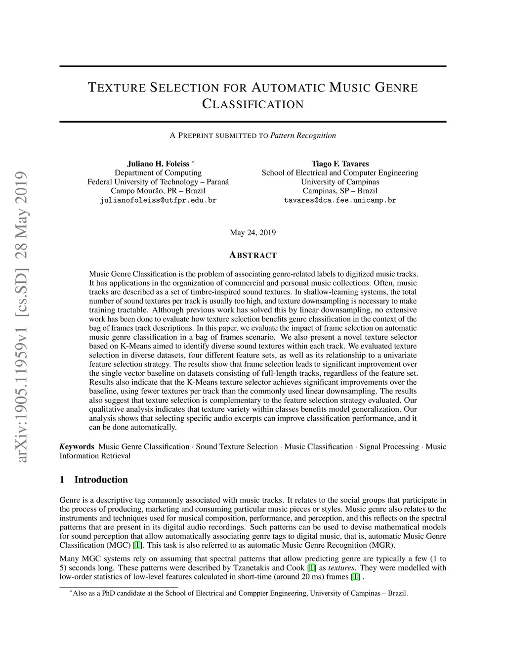 Music Genre Classification is the problem of associating genre-related labels to digitized music tracks. It has applications in the organization of commercial and personal music collections. Often, music tracks are described as a set of timbre-inspired sound textures. In shallow-learning systems, the total number of sound textures per track is usually too high, and texture downsampling is necessary to make training tractable. Although previous work has solved this by linear downsampling, no extensive work has been done to evaluate how texture selection benefits genre classification in the context of the bag of frames track descriptions. In this paper, we evaluate the impact of frame selection on automatic music genre classification in a bag of frames scenario. We also present a novel texture selector based on K-Means aimed to identify diverse sound textures within each track. We evaluated texture selection in diverse datasets, four different feature sets, as well as its relationship to a univariate feature selection strategy. The results show that frame selection leads to significant improvement over the single vector baseline on datasets consisting of full-length tracks, regardless of the feature set. Results also indicate that the K-Means texture selector achieves significant improvements over the baseline, using fewer textures per track than the commonly used linear downsampling. The results also suggest that texture selection is complementary to the feature selection strategy evaluated. Our qualitative analysis indicates that texture variety within classes benefits model generalization. Our analysis shows that selecting specific audio excerpts can improve classification performance, and it can be done automatically.