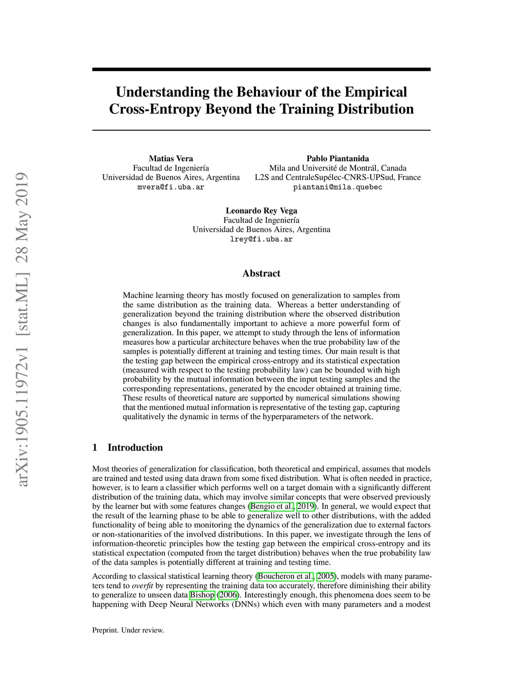 Machine learning theory has mostly focused on generalization to samples from the same distribution as the training data. Whereas a better understanding of generalization beyond the training distribution where the observed distribution changes is also fundamentally important to achieve a more powerful form of generalization. In this paper, we attempt to study through the lens of information measures how a particular architecture behaves when the true probability law of the samples is potentially different at training and testing times. Our main result is that the testing gap between the empirical cross-entropy and its statistical expectation (measured with respect to the testing probability law) can be bounded with high probability by the mutual information between the input testing samples and the corresponding representations, generated by the encoder obtained at training time. These results of theoretical nature are supported by numerical simulations showing that the mentioned mutual information is representative of the testing gap, capturing qualitatively the dynamic in terms of the hyperparameters of the network.