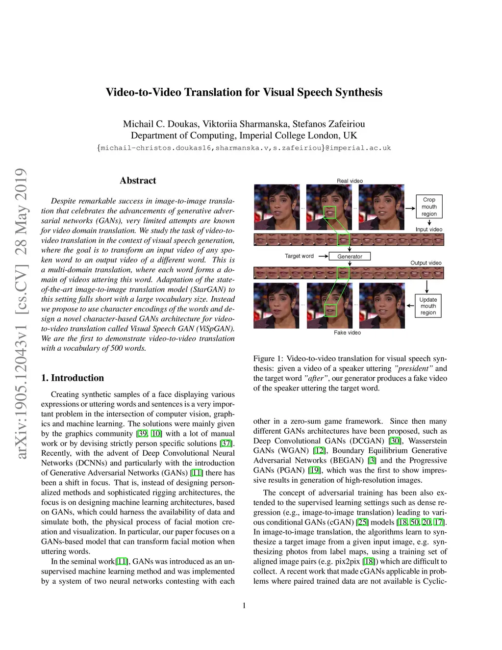 Despite remarkable success in image-to-image translation that celebrates the advancements of generative adversarial networks (GANs), very limited attempts are known for video domain translation. We study the task of video-to-video translation in the context of visual speech generation, where the goal is to transform an input video of any spoken word to an output video of a different word. This is a multi-domain translation, where each word forms a domain of videos uttering this word. Adaptation of the state-of-the-art image-to-image translation model (StarGAN) to this setting falls short with a large vocabulary size. Instead we propose to use character encodings of the words and design a novel character-based GANs architecture for video-to-video translation called Visual Speech GAN (ViSpGAN). We are the first to demonstrate video-to-video translation with a vocabulary of 500 words.