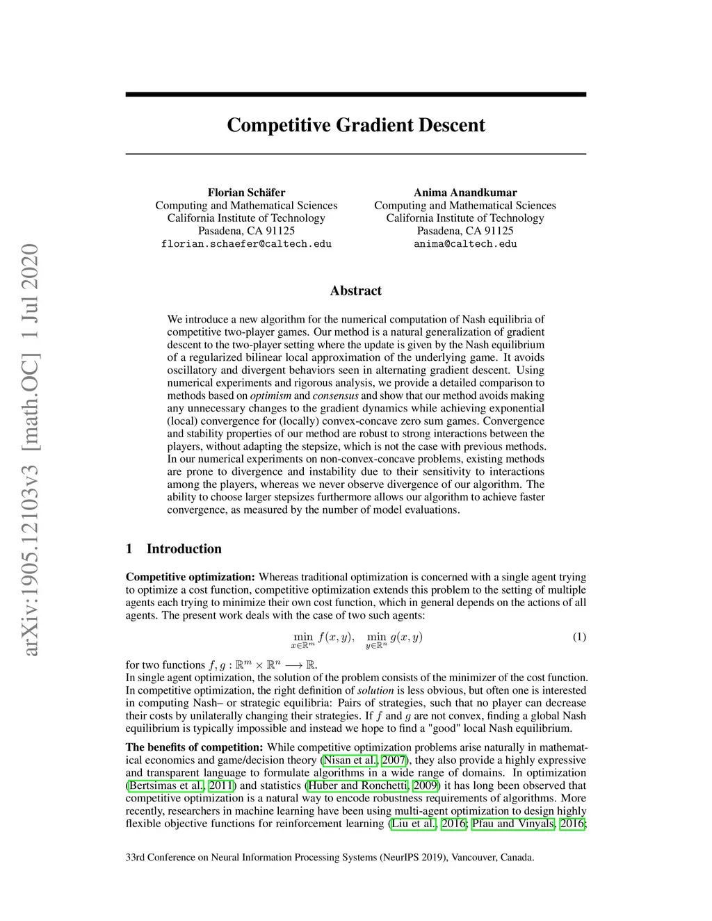 We introduce a new algorithm for the numerical computation of Nash equilibria of competitive two-player games. Our method is a natural generalization of gradient descent to the two-player setting where the update is given by the Nash equilibrium of a regularized bilinear local approximation of the underlying game. It avoids oscillatory and divergent behaviors seen in alternating gradient descent. Using numerical experiments and rigorous analysis, we provide a detailed comparison to methods based on \emph{optimism} and \emph{consensus} and show that our method avoids making any unnecessary changes to the gradient dynamics while achieving exponential (local) convergence for (locally) convex-concave zero sum games. Convergence and stability properties of our method are robust to strong interactions between the players, without adapting the stepsize, which is not the case with previous methods. In our numerical experiments on non-convex-concave problems, existing methods are prone to divergence and instability due to their sensitivity to interactions among the players, whereas we never observe divergence of our algorithm. The ability to choose larger stepsizes furthermore allows our algorithm to achieve faster convergence, as measured by the number of model evaluations.