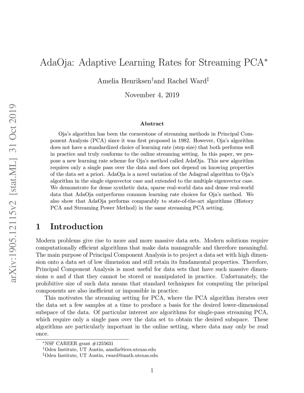 AdaOja: Adaptive Learning Rates for Streaming PCA