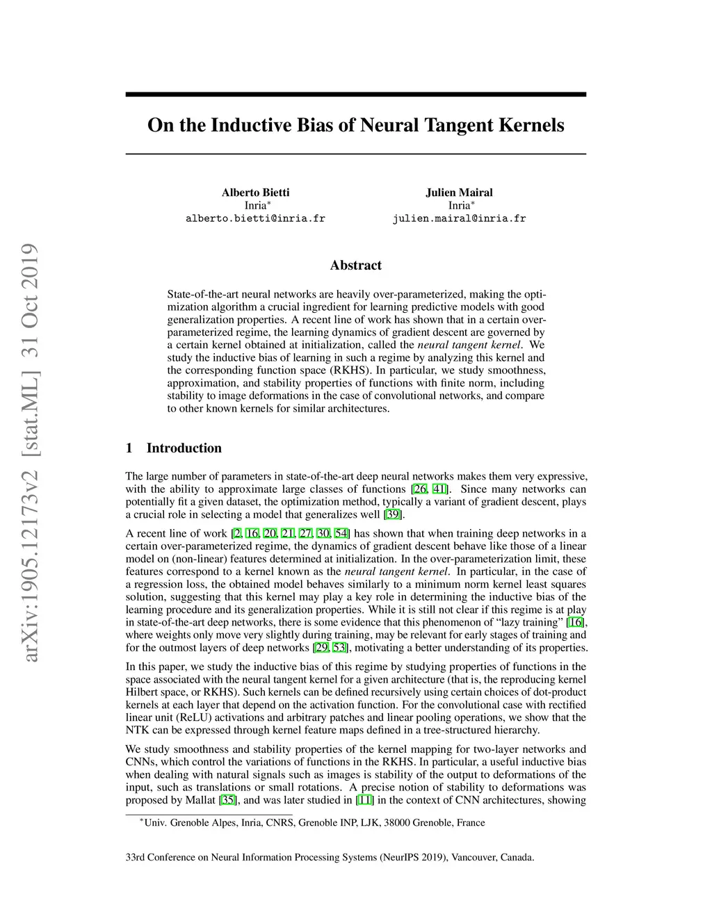 State-of-the-art neural networks are heavily over-parameterized, making the optimization algorithm a crucial ingredient for learning predictive models with good generalization properties. A recent line of work has shown that in a certain over-parameterized regime, the learning dynamics of gradient descent are governed by a certain kernel obtained at initialization, called the neural tangent kernel. We study the inductive bias of learning in such a regime by analyzing this kernel and the corresponding function space (RKHS). In particular, we study smoothness, approximation, and stability properties of functions with finite norm, including stability to image deformations in the case of convolutional networks, and compare to other known kernels for similar architectures.