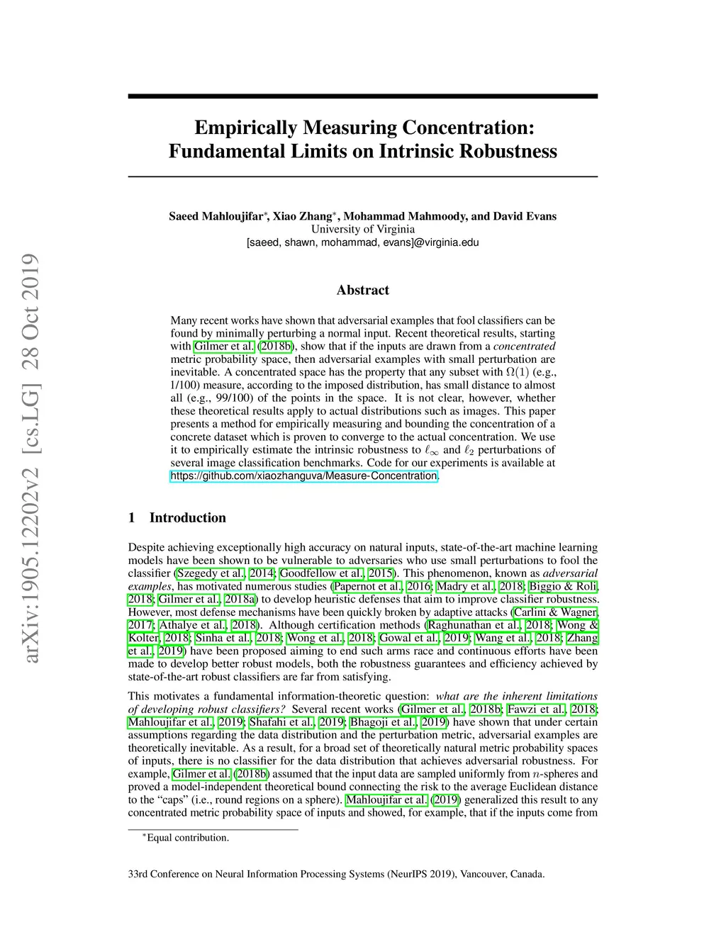 Many recent works have shown that adversarial examples that fool classifiers can be found by minimally perturbing a normal input. Recent theoretical results, starting with Gilmer et al. (2018b), show that if the inputs are drawn from a concentrated metric probability space, then adversarial examples with small perturbation are inevitable. A concentrated space has the property that any subset with (e.g., 1/100) measure, according to the imposed distribution, has small distance to almost all (e.g., 99/100) of the points in the space. It is not clear, however, whether these theoretical results apply to actual distributions such as images. This paper presents a method for empirically measuring and bounding the concentration of a concrete dataset which is proven to converge to the actual concentration. We use it to empirically estimate the intrinsic robustness to and perturbations of several image classification benchmarks. Code for our experiments is available at https://github.com/xiaozhanguva/Measure-Concentration.