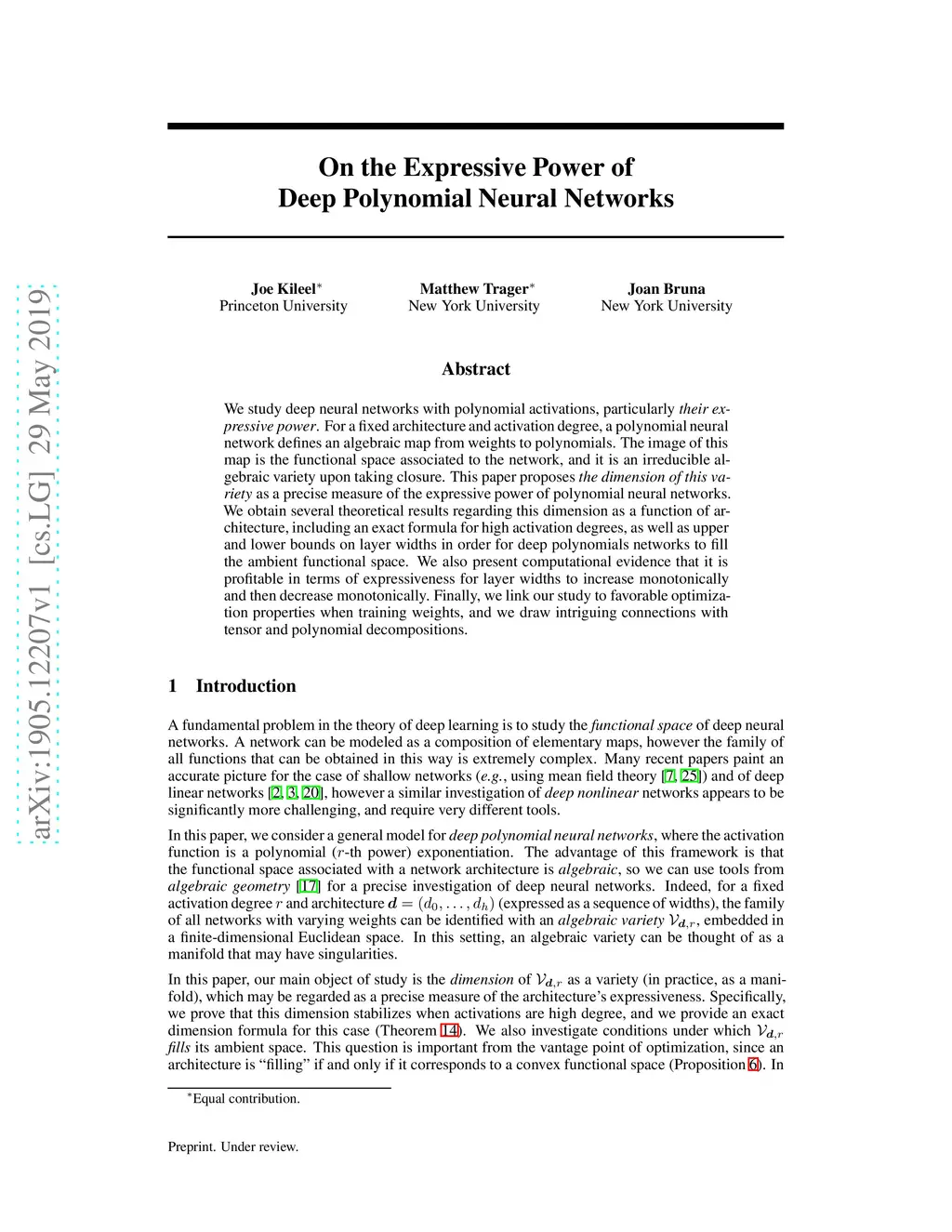 We study deep neural networks with polynomial activations, particularly their expressive power. For a fixed architecture and activation degree, a polynomial neural network defines an algebraic map from weights to polynomials. The image of this map is the functional space associated to the network, and it is an irreducible algebraic variety upon taking closure. This paper proposes the dimension of this variety as a precise measure of the expressive power of polynomial neural networks. We obtain several theoretical results regarding this dimension as a function of architecture, including an exact formula for high activation degrees, as well as upper and lower bounds on layer widths in order for deep polynomials networks to fill the ambient functional space. We also present computational evidence that it is profitable in terms of expressiveness for layer widths to increase monotonically and then decrease monotonically. Finally, we link our study to favorable optimization properties when training weights, and we draw intriguing connections with tensor and polynomial decompositions.