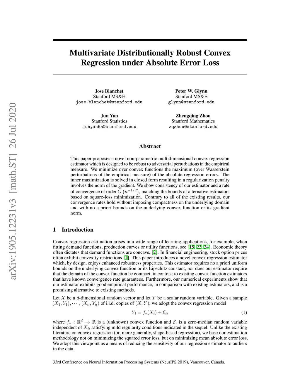 This paper proposes a novel non-parametric multidimensional convex regression estimator which is designed to be robust to adversarial perturbations in the empirical measure. We minimize over convex functions the maximum (over Wasserstein perturbations of the empirical measure) of the absolute regression errors. The inner maximization is solved in closed form resulting in a regularization penalty involves the norm of the gradient. We show consistency of our estimator and a rate of convergence of order $ \widetilde{O}\left( n^{-1/d}\right) $, matching the bounds of alternative estimators based on square-loss minimization. Contrary to all of the existing results, our convergence rates hold without imposing compactness on the underlying domain and with no a priori bounds on the underlying convex function or its gradient norm.