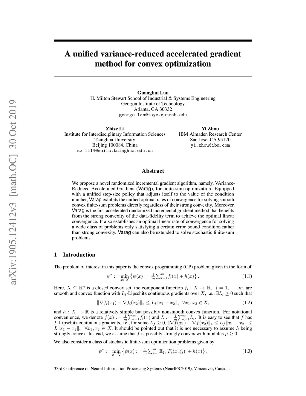 We propose a novel randomized incremental gradient algorithm, namely, VAriance-Reduced Accelerated Gradient (Varag), for finite-sum optimization. Equipped with a unified step-size policy that adjusts itself to the value of the condition number, Varag exhibits the unified optimal rates of convergence for solving smooth convex finite-sum problems directly regardless of their strong convexity. Moreover, Varag is the first accelerated randomized incremental gradient method that benefits from the strong convexity of the data-fidelity term to achieve the optimal linear convergence. It also establishes an optimal linear rate of convergence for solving a wide class of problems only satisfying a certain error bound condition rather than strong convexity. Varag can also be extended to solve stochastic finite-sum problems.