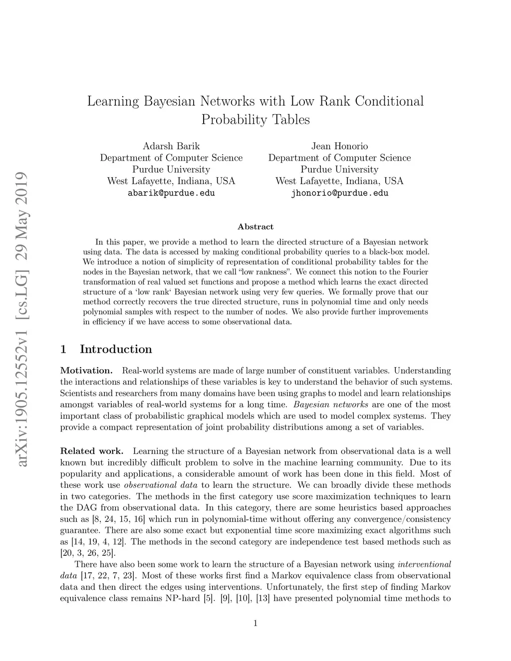In this paper, we provide a method to learn the directed structure of a Bayesian network using data. The data is accessed by making conditional probability queries to a black-box model. We introduce a notion of simplicity of representation of conditional probability tables for the nodes in the Bayesian network, that we call "low rankness". We connect this notion to the Fourier transformation of real valued set functions and propose a method which learns the exact directed structure of a `low rank` Bayesian network using very few queries. We formally prove that our method correctly recovers the true directed structure, runs in polynomial time and only needs polynomial samples with respect to the number of nodes. We also provide further improvements in efficiency if we have access to some observational data.
