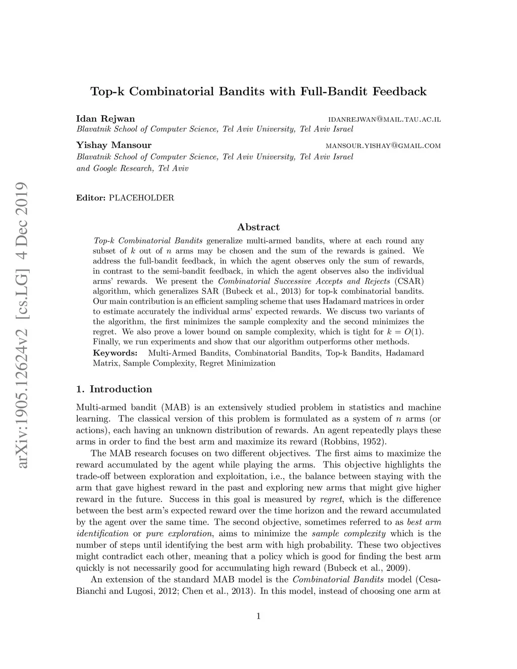 Combinatorial Bandits generalize multi-armed bandits, where k out of n arms are chosen at each round and the sum of the rewards is gained. We address the full-bandit feedback, in which the agent observes only the sum of rewards, in contrast to the semi-bandit feedback, in which the agent observes also the individual arms' rewards. We present the Combinatorial Successive Accepts and Rejects (CSAR) algorithm, which is a generalization of the SAR algorithm (Bubeck et al. 2013) for the combinatorial setting. Our main contribution is an efficient sampling scheme that uses Hadamard matrices in order to estimate accurately the individual arms' expected rewards. We discuss two variants of the algorithm, the first minimizes the sample complexity and the second minimizes the regret. For the sample complexity we also prove a matching lower bound that shows it is optimal. For the regret minimization, we prove a lower bound which is tight up to a factor of k. Finally, we run experiments and show that our algorithm outperforms other methods.