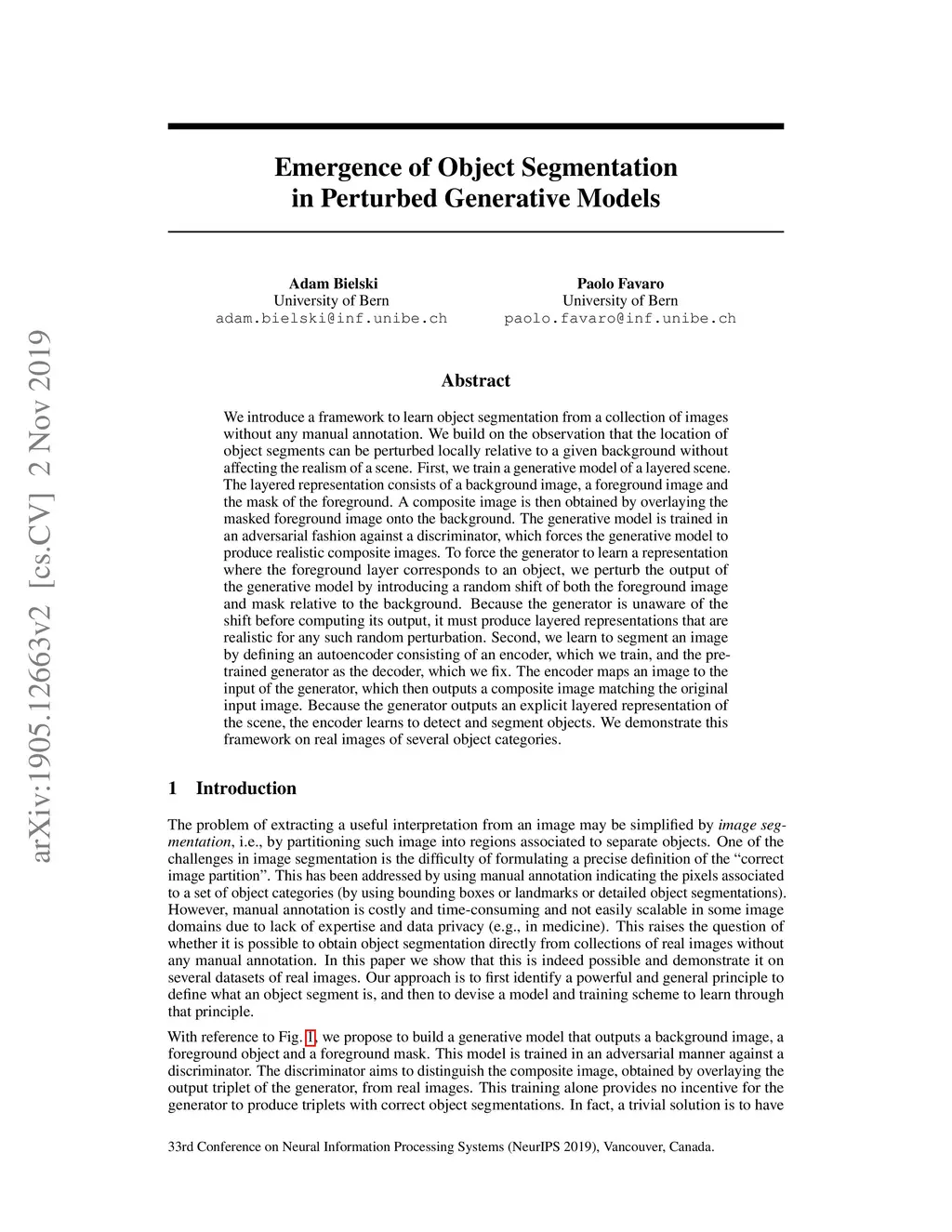 We introduce a novel framework to build a model that can learn how to segment objects from a collection of images without any human annotation. Our method builds on the observation that the location of object segments can be perturbed locally relative to a given background without affecting the realism of a scene. Our approach is to first train a generative model of a layered scene. The layered representation consists of a background image, a foreground image and the mask of the foreground. A composite image is then obtained by overlaying the masked foreground image onto the background. The generative model is trained in an adversarial fashion against a discriminator, which forces the generative model to produce realistic composite images. To force the generator to learn a representation where the foreground layer corresponds to an object, we perturb the output of the generative model by introducing a random shift of both the foreground image and mask relative to the background. Because the generator is unaware of the shift before computing its output, it must produce layered representations that are realistic for any such random perturbation. Finally, we learn to segment an image by defining an autoencoder consisting of an encoder, which we train, and the pre-trained generator as the decoder, which we freeze. The encoder maps an image to a feature vector, which is fed as input to the generator to give a composite image matching the original input image. Because the generator outputs an explicit layered representation of the scene, the encoder learns to detect and segment objects. We demonstrate this framework on real images of several object categories.