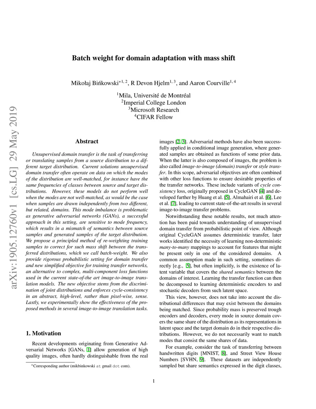 Unsupervised domain transfer is the task of transferring or translating samples from a source distribution to a different target distribution. Current solutions unsupervised domain transfer often operate on data on which the modes of the distribution are well-matched, for instance have the same frequencies of classes between source and target distributions. However, these models do not perform well when the modes are not well-matched, as would be the case when samples are drawn independently from two different, but related, domains. This mode imbalance is problematic as generative adversarial networks (GANs), a successful approach in this setting, are sensitive to mode frequency, which results in a mismatch of semantics between source samples and generated samples of the target distribution. We propose a principled method of re-weighting training samples to correct for such mass shift between the transferred distributions, which we call batch-weight. We also provide rigorous probabilistic setting for domain transfer and new simplified objective for training transfer networks, an alternative to complex, multi-component loss functions used in the current state-of-the art image-to-image translation models. The new objective stems from the discrimination of joint distributions and enforces cycle-consistency in an abstract, high-level, rather than pixel-wise, sense. Lastly, we experimentally show the effectiveness of the proposed methods in several image-to-image translation tasks.