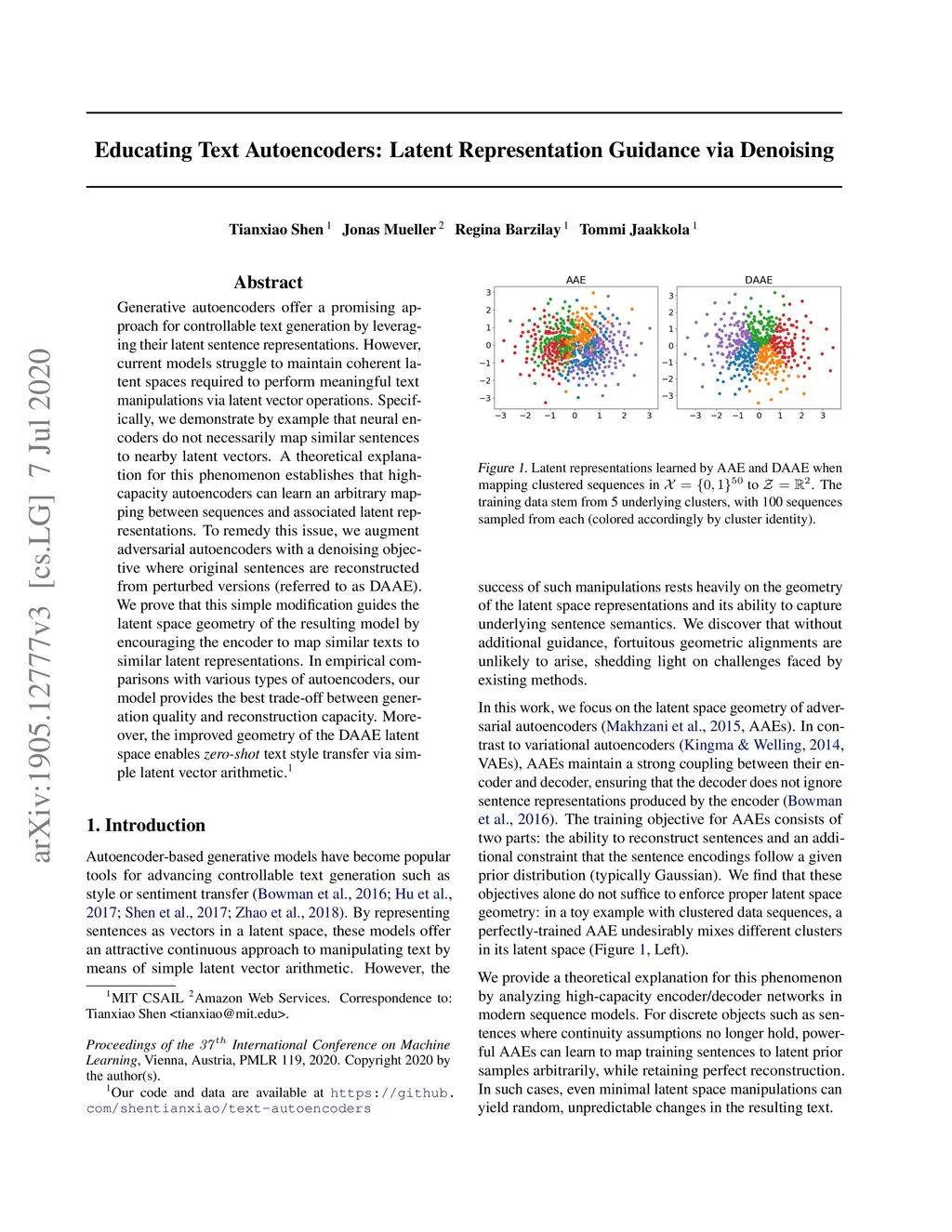 Generative autoencoders offer a promising approach for controllable text generation by leveraging their latent sentence representations. However, current models struggle to maintain coherent latent spaces required to perform meaningful text manipulations via latent vector operations. Specifically, we demonstrate by example that neural encoders do not necessarily map similar sentences to nearby latent vectors. A theoretical explanation for this phenomenon establishes that high capacity autoencoders can learn an arbitrary mapping between sequences and associated latent representations. To remedy this issue, we augment adversarial autoencoders with a denoising objective where original sentences are reconstructed from perturbed versions (referred to as DAAE). We prove that this simple modification guides the latent space geometry of the resulting model by encouraging the encoder to map similar texts to similar latent representations. In empirical comparisons with various types of autoencoders, our model provides the best trade-off between generation quality and reconstruction capacity. Moreover, the improved geometry of the DAAE latent space enables zero-shot text style transfer via simple latent vector arithmetic.