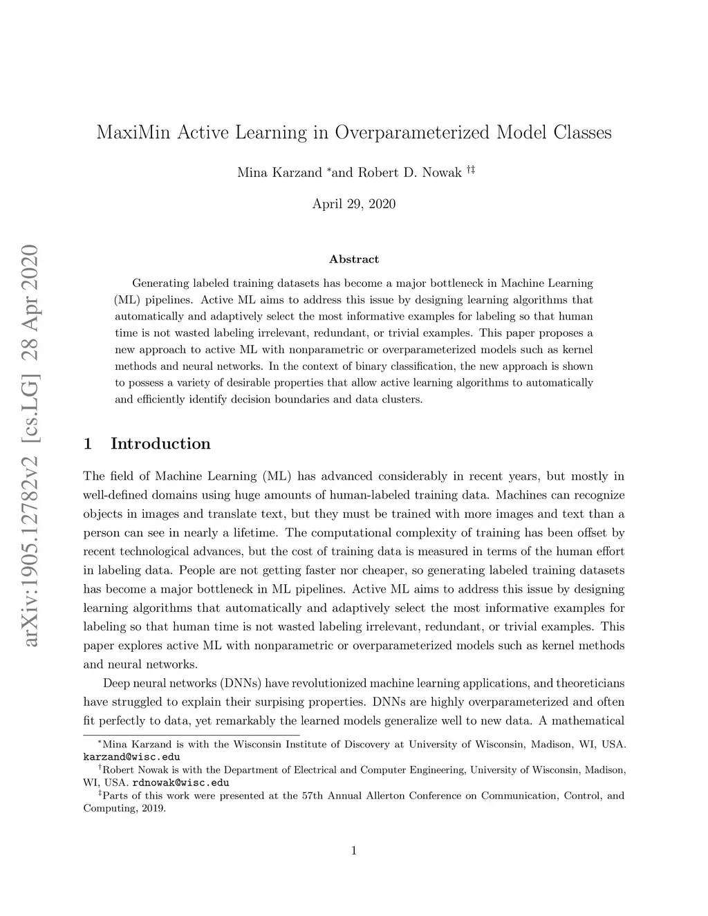 Overparameterized models that interpolate training data often display surprisingly good generalization properties. Specifically, minimum norm solutions have been shown to generalize well in the overparameterized, interpolating regime. This paper introduces a new framework for active learning based on the notion of minimum norm interpolators. We analytically study its properties and behavior in the kernel-based setting and present experimental studies with kernel methods and neural networks. In general, active learning algorithms adaptively select examples for labeling that (1) rule-out as many (incompatible) classifiers as possible at each step and/or (2) discover cluster structure in unlabeled data and label representative examples from each cluster. We show that our new active learning approach based on a minimum norm heuristic automatically exploits both these strategies.