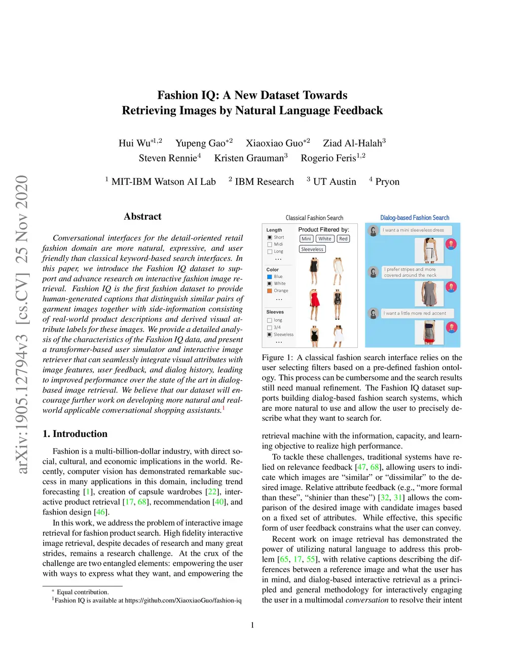Conversational interfaces for the detail-oriented retail fashion domain are more natural, expressive, and user friendly than classical keyword-based search interfaces. In this paper, we introduce the Fashion IQ dataset to support and advance research on interactive fashion image retrieval. Fashion IQ is the first fashion dataset to provide human-generated captions that distinguish similar pairs of garment images together with side-information consisting of real-world product descriptions and derived visual attribute labels for these images. We provide a detailed analysis of the characteristics of the Fashion IQ data, and present a transformer-based user simulator and interactive image retriever that can seamlessly integrate visual attributes with image features, user feedback, and dialog history, leading to improved performance over the state of the art in dialog-based image retrieval. We believe that our dataset will encourage further work on developing more natural and real-world applicable conversational shopping assistants.