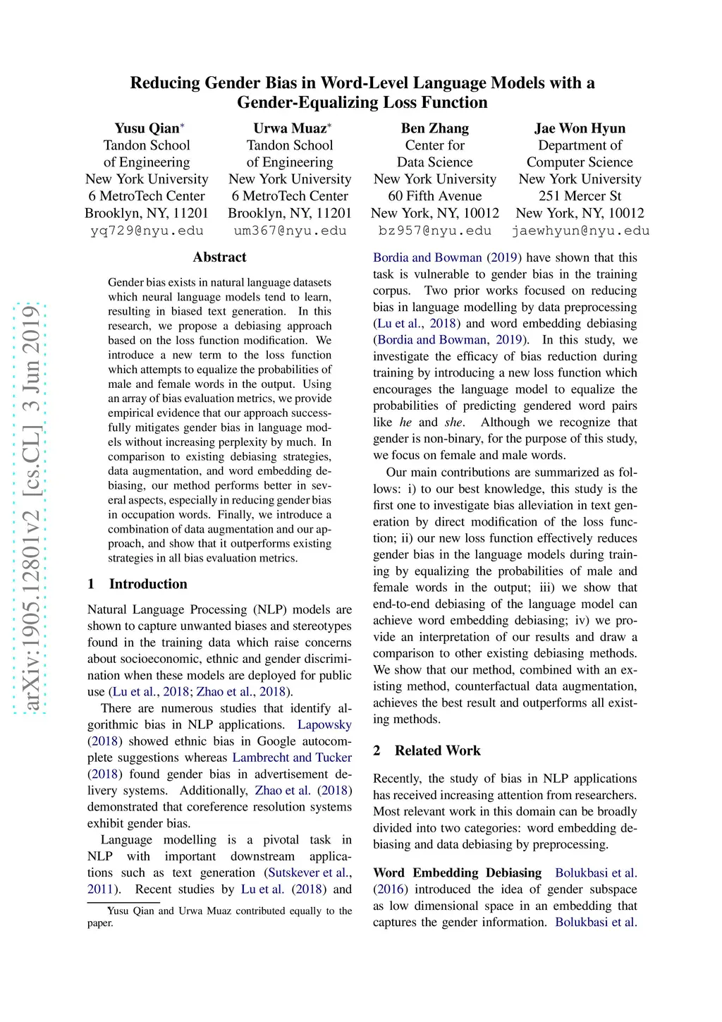 Gender bias exists in natural language datasets which neural language models tend to learn, resulting in biased text generation. In this research, we propose a debiasing approach based on the loss function modification. We introduce a new term to the loss function which attempts to equalize the probabilities of male and female words in the output. Using an array of bias evaluation metrics, we provide empirical evidence that our approach successfully mitigates gender bias in language models without increasing perplexity. In comparison to existing debiasing strategies, data augmentation, and word embedding debiasing, our method performs better in several aspects, especially in reducing gender bias in occupation words. Finally, we introduce a combination of data augmentation and our approach, and show that it outperforms existing strategies in all bias evaluation metrics.
