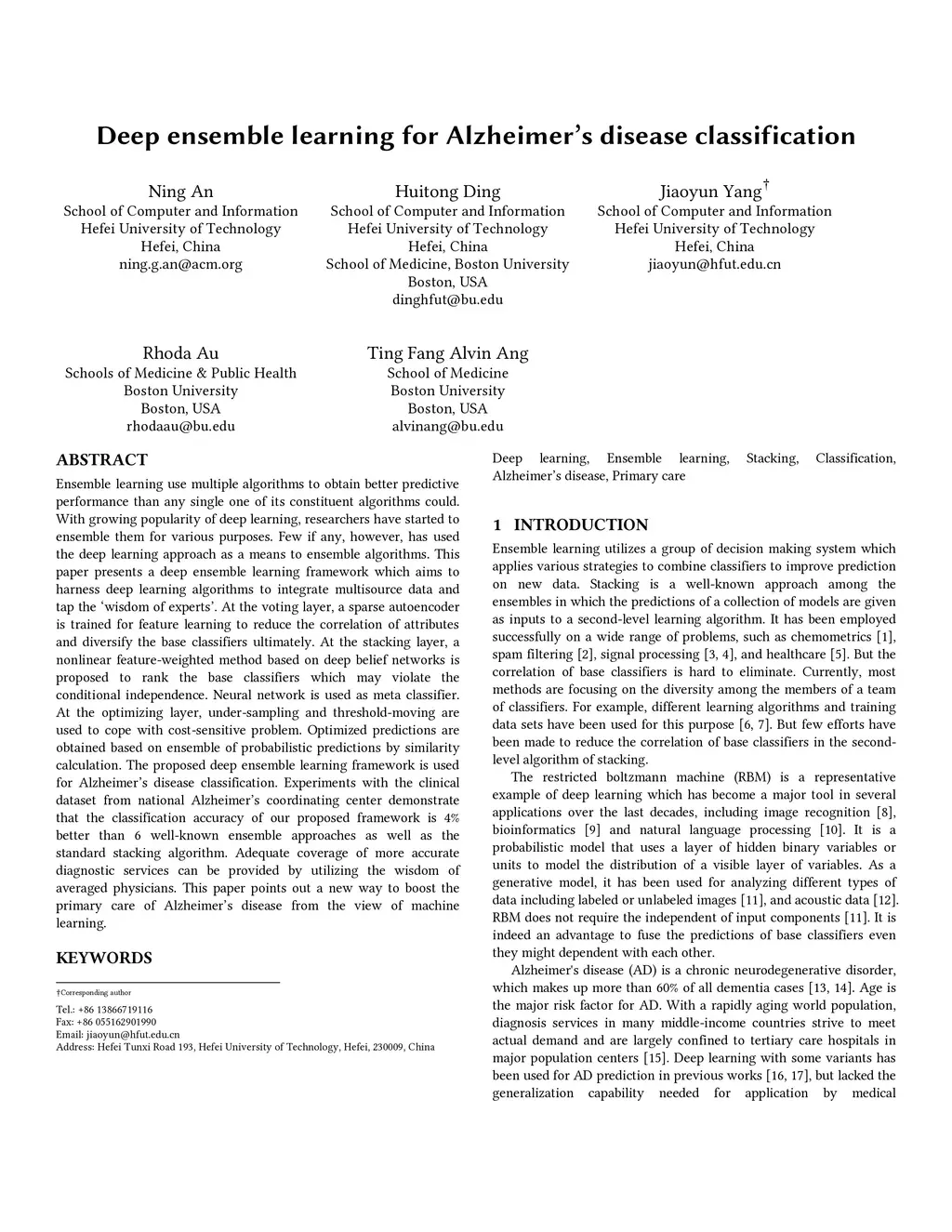 Ensemble learning use multiple algorithms to obtain better predictive performance than any single one of its constituent algorithms could. With growing popularity of deep learning, researchers have started to ensemble them for various purposes. Few if any, however, has used the deep learning approach as a means to ensemble algorithms. This paper presents a deep ensemble learning framework which aims to harness deep learning algorithms to integrate multisource data and tap the wisdom of experts. At the voting layer, a sparse autoencoder is trained for feature learning to reduce the correlation of attributes and diversify the base classifiers ultimately. At the stacking layer, a nonlinear feature-weighted method based on deep belief networks is proposed to rank the base classifiers which may violate the conditional independence. Neural network is used as meta classifier. At the optimizing layer, under-sampling and threshold-moving are used to cope with cost-sensitive problem. Optimized predictions are obtained based on ensemble of probabilistic predictions by similarity calculation. The proposed deep ensemble learning framework is used for Alzheimers disease classification. Experiments with the clinical dataset from national Alzheimers coordinating center demonstrate that the classification accuracy of our proposed framework is 4% better than 6 well-known ensemble approaches as well as the standard stacking algorithm. Adequate coverage of more accurate diagnostic services can be provided by utilizing the wisdom of averaged physicians. This paper points out a new way to boost the primary care of Alzheimers disease from the view of machine learning.