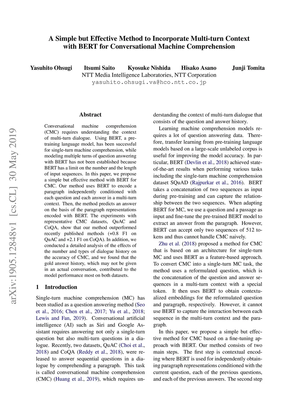 BERT for Conversational Machine Comprehension