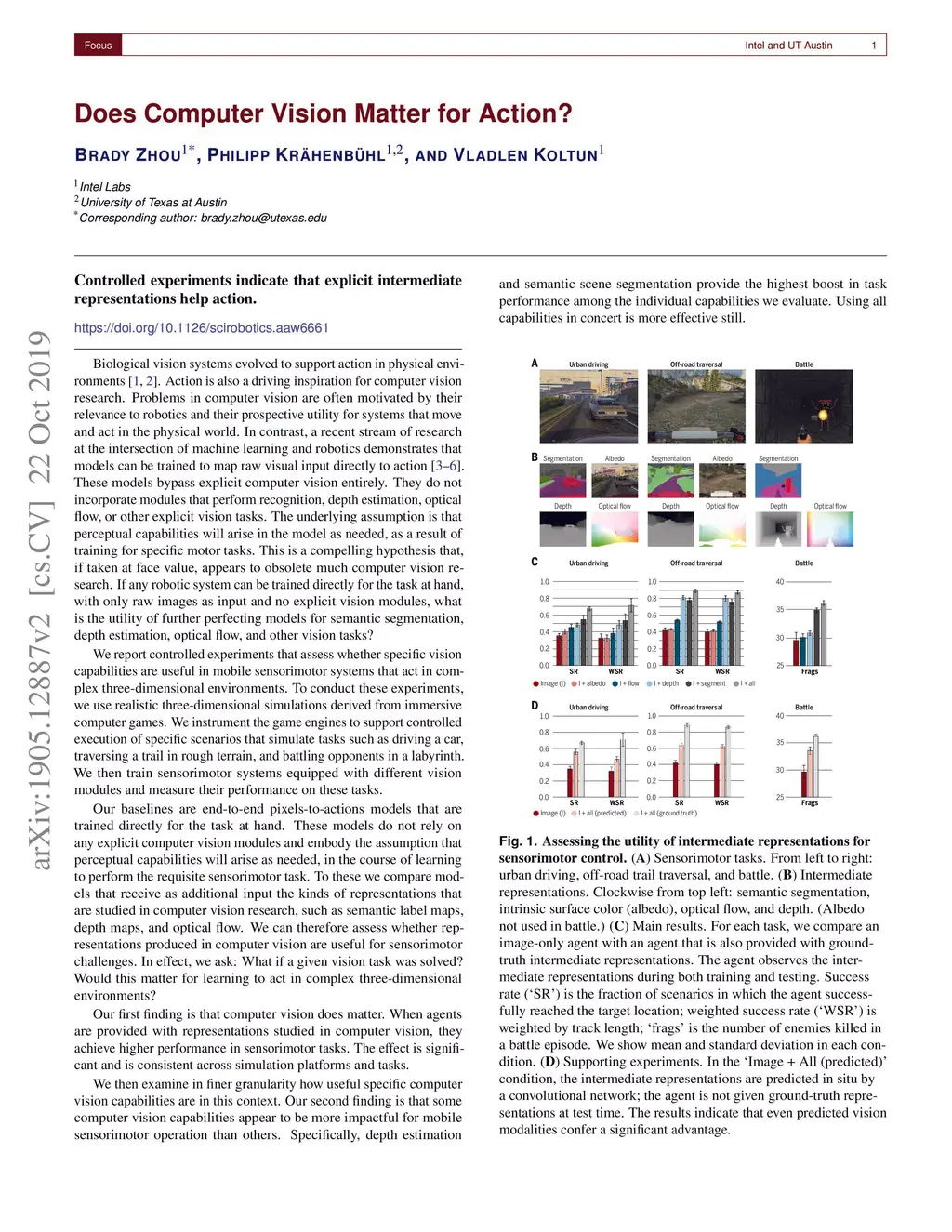 Computer vision produces representations of scene content. Much computer vision research is predicated on the assumption that these intermediate representations are useful for action. Recent work at the intersection of machine learning and robotics calls this assumption into question by training sensorimotor systems directly for the task at hand, from pixels to actions, with no explicit intermediate representations. Thus the central question of our work: Does computer vision matter for action? We probe this question and its offshoots via immersive simulation, which allows us to conduct controlled reproducible experiments at scale. We instrument immersive three-dimensional environments to simulate challenges such as urban driving, off-road trail traversal, and battle. Our main finding is that computer vision does matter. Models equipped with intermediate representations train faster, achieve higher task performance, and generalize better to previously unseen environments. A video that summarizes the work and illustrates the results can be found at https://youtu.be/4MfWa2yZ0Jc
