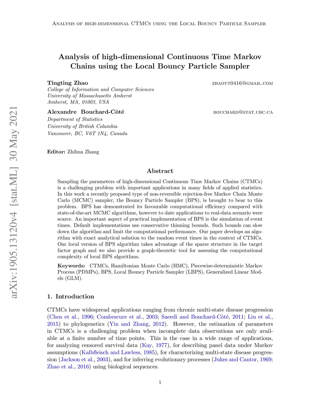 Sampling the parameters of high-dimensional Continuous Time Markov Chains (CTMC) is a challenging problem with important applications in many fields of applied statistics. In this work a recently proposed type of non-reversible rejection-free Markov Chain Monte Carlo (MCMC) sampler, the Bouncy Particle Sampler (BPS), is brought to bear to this problem. BPS has demonstrated its favorable computational efficiency compared with state-of-the-art MCMC algorithms, however to date applications to real-data scenario were scarce. An important aspect of the practical implementation of BPS is the simulation of event times. Default implementations use conservative thinning bounds. Such bounds can slow down the algorithm and limit the computational performance. Our paper develops an algorithm with an exact analytical solution to the random event times in the context of CTMCs. Our local version of BPS algorithm takes advantage of the sparse structure in the target factor graph and we also provide a framework for assessing the computational complexity of local BPS algorithms.