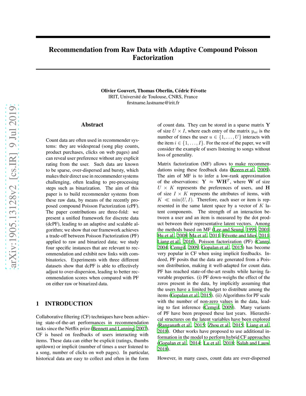 Count data are often used in recommender systems: they are widespread (song play counts, product purchases, clicks on web pages) and can reveal user preference without any explicit rating from the user. Such data are known to be sparse, over-dispersed and bursty, which makes their direct use in recommender systems challenging, often leading to pre-processing steps such as binarization. The aim of this paper is to build recommender systems from these raw data, by means of the recently proposed compound Poisson Factorization (cPF). The paper contributions are three-fold: we present a unified framework for discrete data (dcPF), leading to an adaptive and scalable algorithm; we show that our framework achieves a trade-off between Poisson Factorization (PF) applied to raw and binarized data; we study four specific instances that are relevant to recommendation and exhibit new links with combinatorics. Experiments with three different datasets show that dcPF is able to effectively adjust to over-dispersion, leading to better recommendation scores when compared with PF on either raw or binarized data.