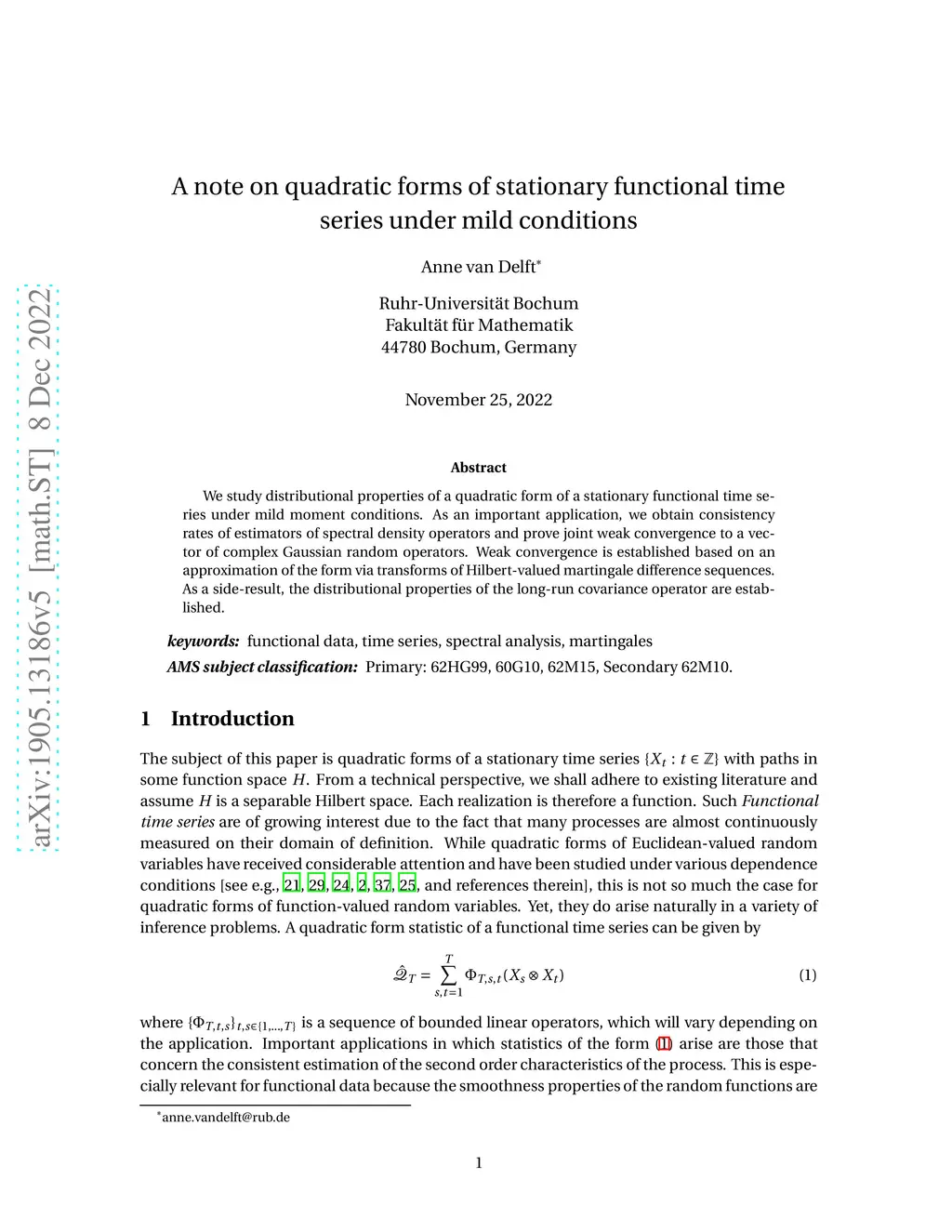 We study distributional properties of a quadratic form of a stationary functional time series under mild moment conditions. As an important application, we obtain consistency rates of estimators of spectral density operators and prove joint weak convergence to a vector of complex Gaussian random operators. Weak convergence is established based on an approximation of the form via transforms of Hilbert-valued martingale difference sequences. As a side-result, the distributional properties of the long-run covariance operator are established.