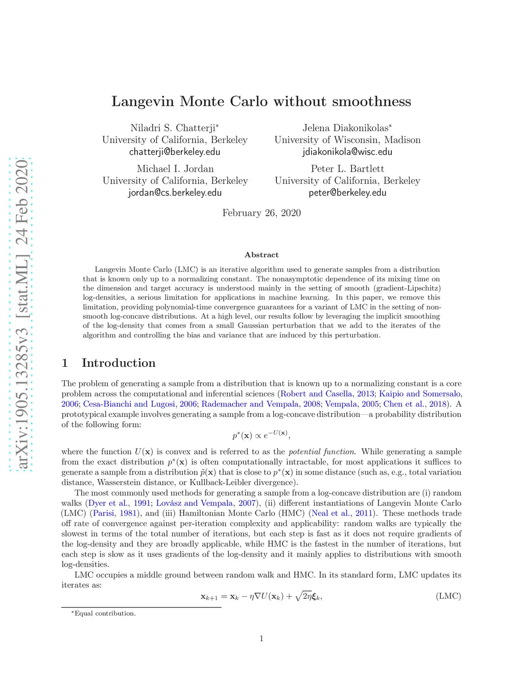 Langevin Monte Carlo (LMC) is an iterative algorithm used to generate samples from a distribution that is known only up to a normalizing constant. The nonasymptotic dependence of its mixing time on the dimension and target accuracy is understood mainly in the setting of smooth (gradient-Lipschitz) log-densities, a serious limitation for applications in machine learning. In this paper, we remove this limitation, providing polynomial-time convergence guarantees for a variant of LMC in the setting of nonsmooth log-concave distributions. At a high level, our results follow by leveraging the implicit smoothing of the log-density that comes from a small Gaussian perturbation that we add to the iterates of the algorithm and controlling the bias and variance that are induced by this perturbation.