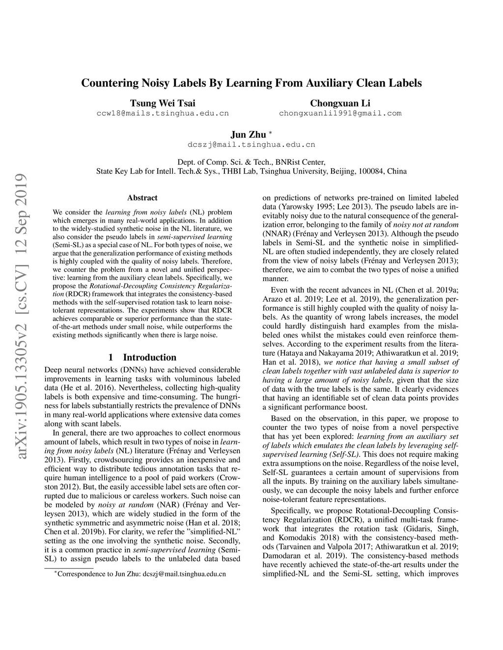 We consider the learning from noisy labels (NL) problem which emerges in many real-world applications. In addition to the widely-studied synthetic noise in the NL literature, we also consider the pseudo labels in semi-supervised learning (Semi-SL) as a special case of NL. For both types of noise, we argue that the generalization performance of existing methods is highly coupled with the quality of noisy labels. Therefore, we counter the problem from a novel and unified perspective: learning from the auxiliary clean labels. Specifically, we propose the Rotational-Decoupling Consistency Regularization (RDCR) framework that integrates the consistency-based methods with the self-supervised rotation task to learn noise-tolerant representations. The experiments show that RDCR achieves comparable or superior performance than the state-of-the-art methods under small noise, while outperforms the existing methods significantly when there is large noise.