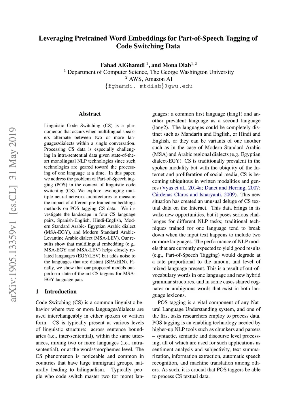 Linguistic Code Switching (CS) is a phenomenon that occurs when multilingual speakers alternate between two or more languages/dialects within a single conversation. Processing CS data is especially challenging in intra-sentential data given state-of-the-art monolingual NLP technologies since such technologies are geared toward the processing of one language at a time. In this paper, we address the problem of Part-of-Speech tagging (POS) in the context of linguistic code switching (CS). We explore leveraging multiple neural network architectures to measure the impact of different pre-trained embeddings methods on POS tagging CS data. We investigate the landscape in four CS language pairs, Spanish-English, Hindi-English, Modern Standard Arabic- Egyptian Arabic dialect (MSA-EGY), and Modern Standard Arabic- Levantine Arabic dialect (MSA-LEV). Our results show that multilingual embedding (e.g., MSA-EGY and MSA-LEV) helps closely related languages (EGY/LEV) but adds noise to the languages that are distant (SPA/HIN). Finally, we show that our proposed models outperform state-of-the-art CS taggers for MSA-EGY language pair.