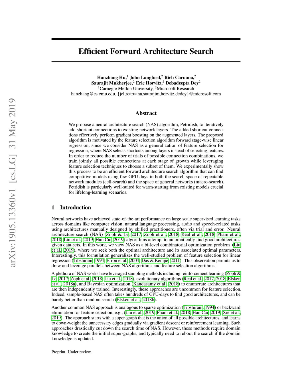 We propose a neural architecture search (NAS) algorithm, Petridish, to iteratively add shortcut connections to existing network layers. The added shortcut connections effectively perform gradient boosting on the augmented layers. The proposed algorithm is motivated by the feature selection algorithm forward stage-wise linear regression, since we consider NAS as a generalization of feature selection for regression, where NAS selects shortcuts among layers instead of selecting features. In order to reduce the number of trials of possible connection combinations, we train jointly all possible connections at each stage of growth while leveraging feature selection techniques to choose a subset of them. We experimentally show this process to be an efficient forward architecture search algorithm that can find competitive models using few GPU days in both the search space of repeatable network modules (cell-search) and the space of general networks (macro-search). Petridish is particularly well-suited for warm-starting from existing models crucial for lifelong-learning scenarios.