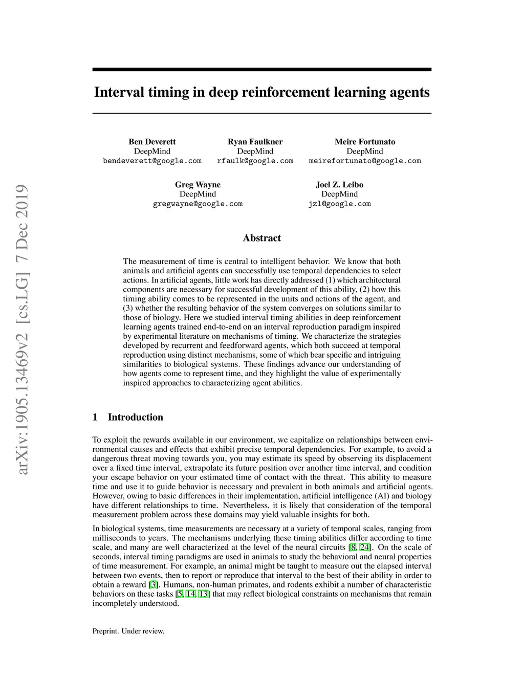 The measurement of time is central to intelligent behavior. We know that both animals and artificial agents can successfully use temporal dependencies to select actions. In artificial agents, little work has directly addressed (1) which architectural components are necessary for successful development of this ability, (2) how this timing ability comes to be represented in the units and actions of the agent, and (3) whether the resulting behavior of the system converges on solutions similar to those of biology. Here we studied interval timing abilities in deep reinforcement learning agents trained end-to-end on an interval reproduction paradigm inspired by experimental literature on mechanisms of timing. We characterize the strategies developed by recurrent and feedforward agents, which both succeed at temporal reproduction using distinct mechanisms, some of which bear specific and intriguing similarities to biological systems. These findings advance our understanding of how agents come to represent time, and they highlight the value of experimentally inspired approaches to characterizing agent abilities.