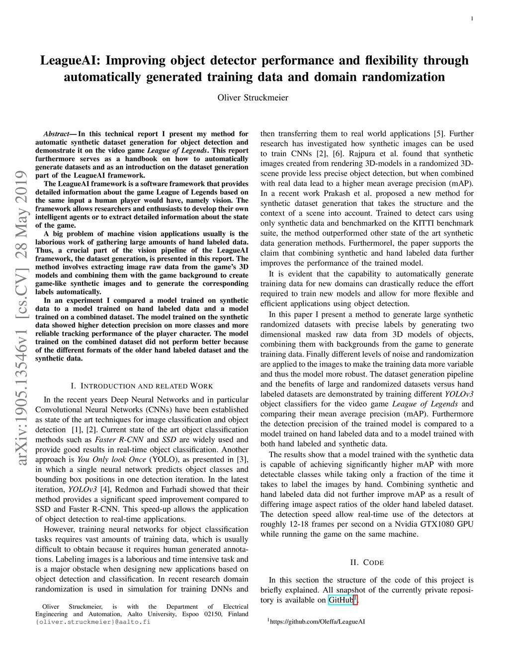 In this technical report I present my method for automatic synthetic dataset generation for object detection and demonstrate it on the video game League of Legends. This report furthermore serves as a handbook on how to automatically generate datasets and as an introduction on the dataset generation part of the LeagueAI framework. The LeagueAI framework is a software framework that provides detailed information about the game League of Legends based on the same input a human player would have, namely vision. The framework allows researchers and enthusiasts to develop their own intelligent agents or to extract detailed information about the state of the game. A big problem of machine vision applications usually is the laborious work of gathering large amounts of hand labeled data. Thus, a crucial part of the vision pipeline of the LeagueAI framework, the dataset generation, is presented in this report. The method involves extracting image raw data from the game's 3D models and combining them with the game background to create game-like synthetic images and to generate the corresponding labels automatically. In an experiment I compared a model trained on synthetic data to a model trained on hand labeled data and a model trained on a combined dataset. The model trained on the synthetic data showed higher detection precision on more classes and more reliable tracking performance of the player character. The model trained on the combined dataset did not perform better because of the different formats of the older hand labeled dataset and the synthetic data.