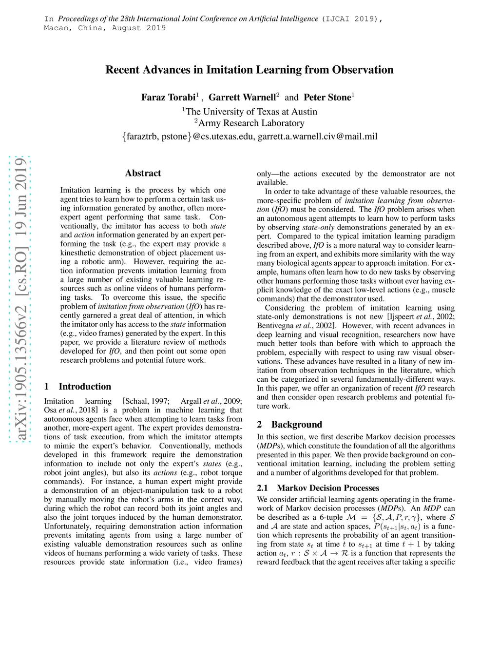 Imitation learning is the process by which one agent tries to learn how to perform a certain task using information generated by another, often more-expert agent performing that same task. Conventionally, the imitator has access to both state and action information generated by an expert performing the task (e.g., the expert may provide a kinesthetic demonstration of object placement using a robotic arm). However, requiring the action information prevents imitation learning from a large number of existing valuable learning resources such as online videos of humans performing tasks. To overcome this issue, the specific problem of imitation from observation (IfO) has recently garnered a great deal of attention, in which the imitator only has access to the state information (e.g., video frames) generated by the expert. In this paper, we provide a literature review of methods developed for IfO, and then point out some open research problems and potential future work.
