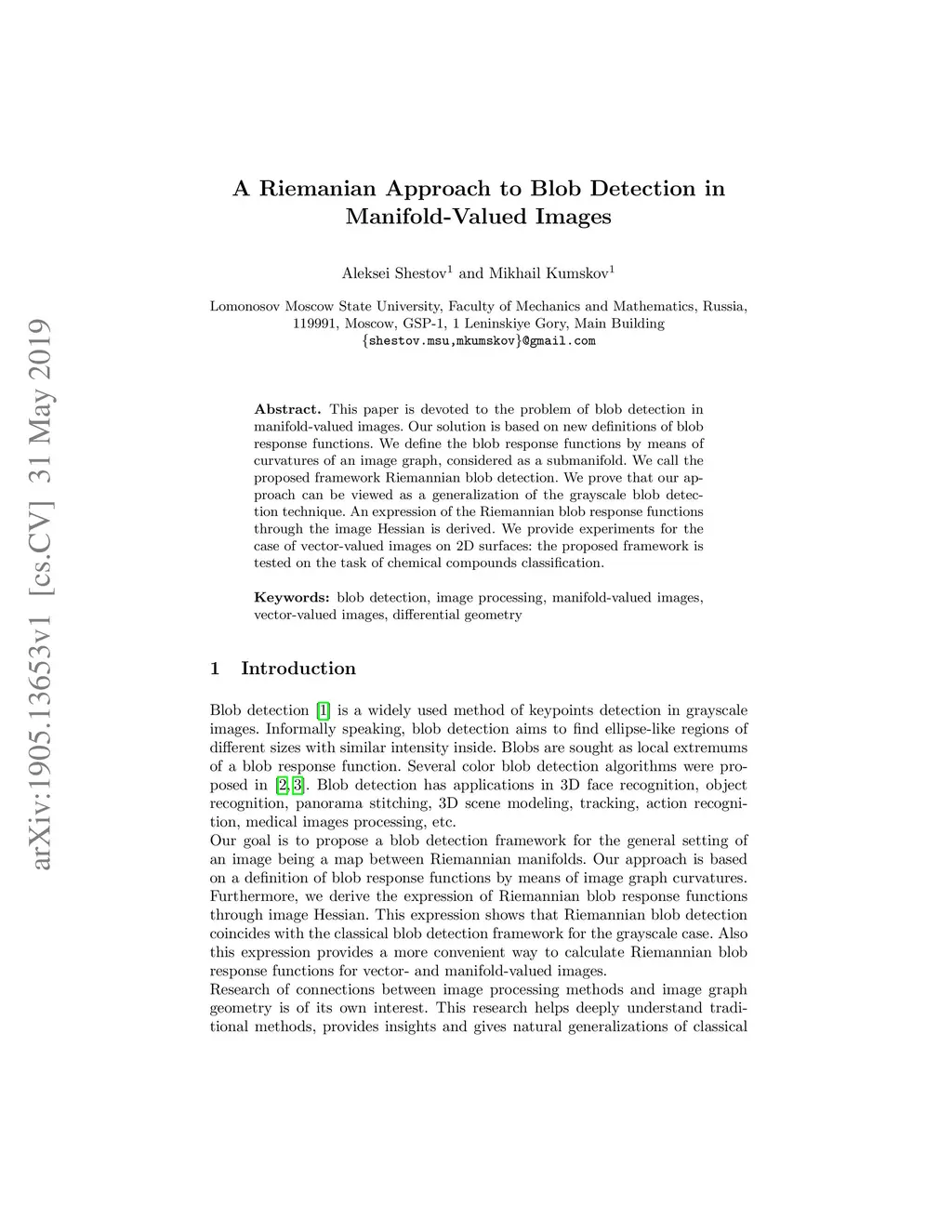 This paper is devoted to the problem of blob detection in manifold-valued images. Our solution is based on new definitions of blob response functions. We define the blob response functions by means of curvatures of an image graph, considered as a submanifold. We call the proposed framework Riemannian blob detection. We prove that our approach can be viewed as a generalization of the grayscale blob detection technique. An expression of the Riemannian blob response functions through the image Hessian is derived. We provide experiments for the case of vector-valued images on 2D surfaces: the proposed framework is tested on the task of chemical compounds classification.