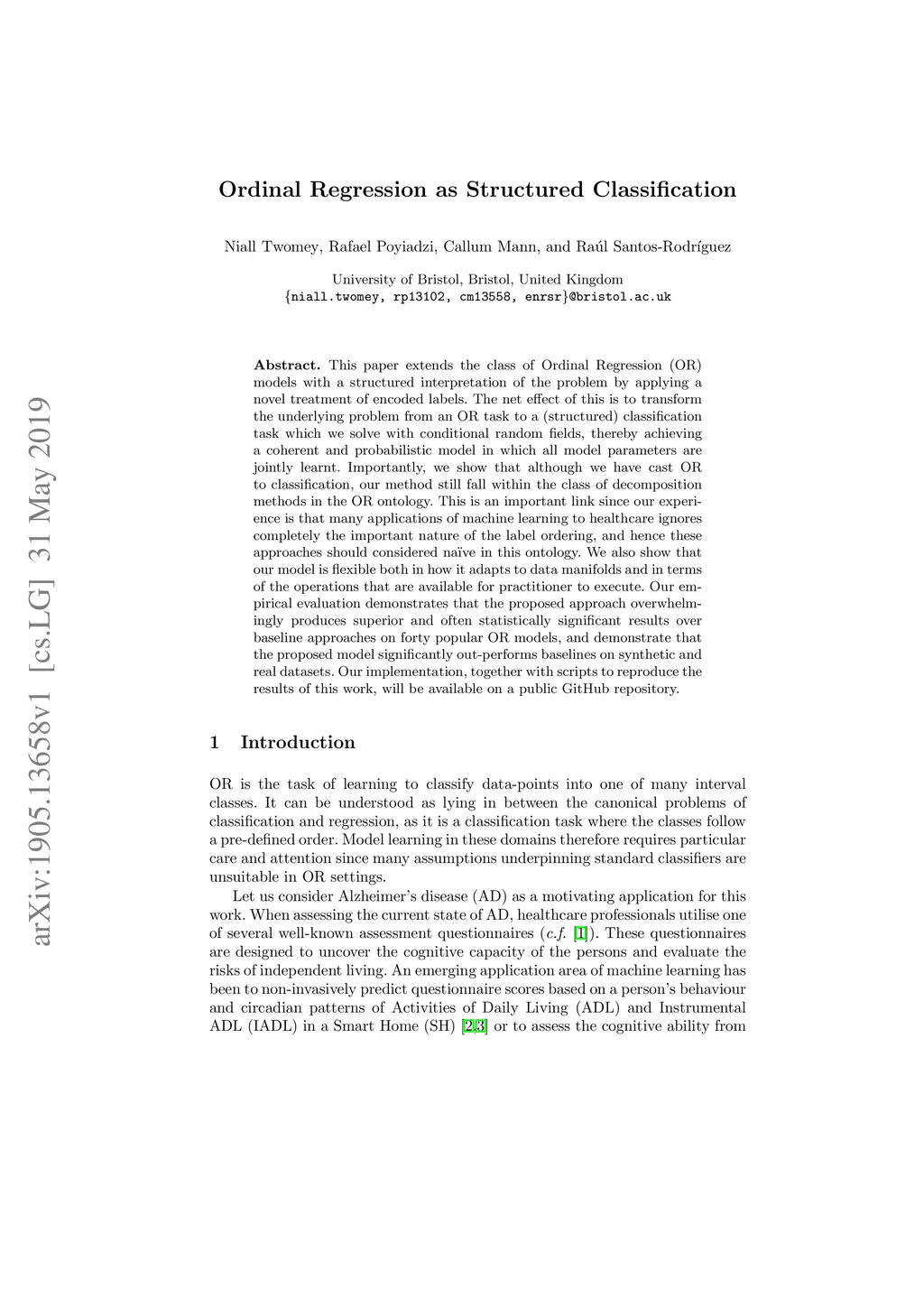 This paper extends the class of ordinal regression models with a structured interpretation of the problem by applying a novel treatment of encoded labels. The net effect of this is to transform the underlying problem from an ordinal regression task to a (structured) classification task which we solve with conditional random fields, thereby achieving a coherent and probabilistic model in which all model parameters are jointly learnt. Importantly, we show that although we have cast ordinal regression to classification, our method still fall within the class of decomposition methods in the ordinal regression ontology. This is an important link since our experience is that many applications of machine learning to healthcare ignores completely the important nature of the label ordering, and hence these approaches should considered naive in this ontology. We also show that our model is flexible both in how it adapts to data manifolds and in terms of the operations that are available for practitioner to execute. Our empirical evaluation demonstrates that the proposed approach overwhelmingly produces superior and often statistically significant results over baseline approaches on forty popular ordinal regression models, and demonstrate that the proposed model significantly out-performs baselines on synthetic and real datasets. Our implementation, together with scripts to reproduce the results of this work, will be available on a public GitHub repository.