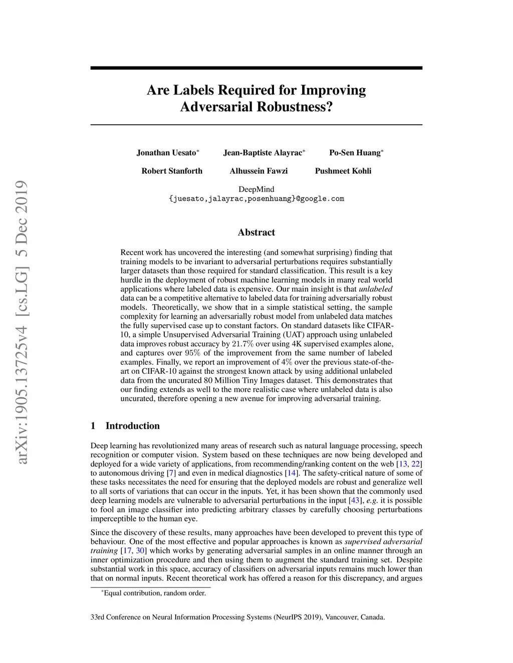 Recent work has uncovered the interesting (and somewhat surprising) finding that training models to be invariant to adversarial perturbations requires substantially larger datasets than those required for standard classification. This result is a key hurdle in the deployment of robust machine learning models in many real world applications where labeled data is expensive. Our main insight is that unlabeled data can be a competitive alternative to labeled data for training adversarially robust models. Theoretically, we show that in a simple statistical setting, the sample complexity for learning an adversarially robust model from unlabeled data matches the fully supervised case up to constant factors. On standard datasets like CIFAR-10, a simple Unsupervised Adversarial Training (UAT) approach using unlabeled data improves robust accuracy by 21.7% over using 4K supervised examples alone, and captures over 95% of the improvement from the same number of labeled examples. Finally, we report an improvement of 4% over the previous state-of-the-art on CIFAR-10 against the strongest known attack by using additional unlabeled data from the uncurated 80 Million Tiny Images dataset. This demonstrates that our finding extends as well to the more realistic case where unlabeled data is also uncurated, therefore opening a new avenue for improving adversarial training.
