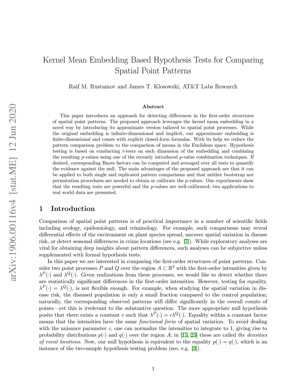 This paper introduces an approach for detecting differences in the first-order structures of spatial point patterns. The proposed approach leverages the kernel mean embedding in a novel way by introducing its approximate version tailored to spatial point processes. While the original embedding is infinite-dimensional and implicit, our approximate embedding is finite-dimensional and comes with explicit closed-form formulas. With its help we reduce the pattern comparison problem to the comparison of means in the Euclidean space. Hypothesis testing is based on conducting t-tests on each dimension of the embedding and combining the resulting p-values using one of the recently introduced p-value combination techniques. If desired, corresponding Bayes factors can be computed and averaged over all tests to quantify the evidence against the null. The main advantages of the proposed approach are that it can be applied to both single and replicated pattern comparisons and that neither bootstrap nor permutation procedures are needed to obtain or calibrate the p-values. Our experiments show that the resulting tests are powerful and the p-values are well-calibrated; two applications to real world data are presented.