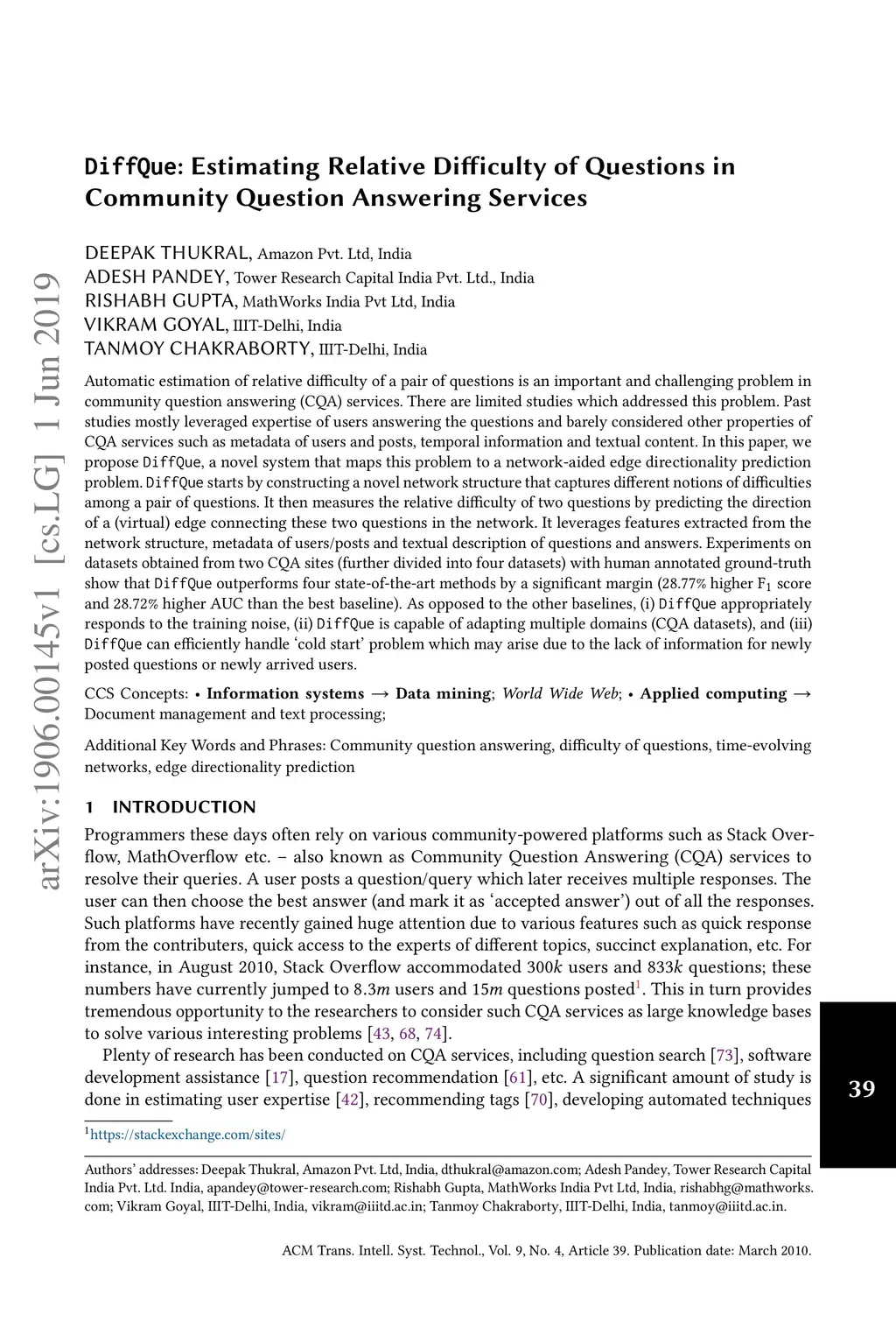 DiffQue: Estimating Relative Difficulty of Questions in Community