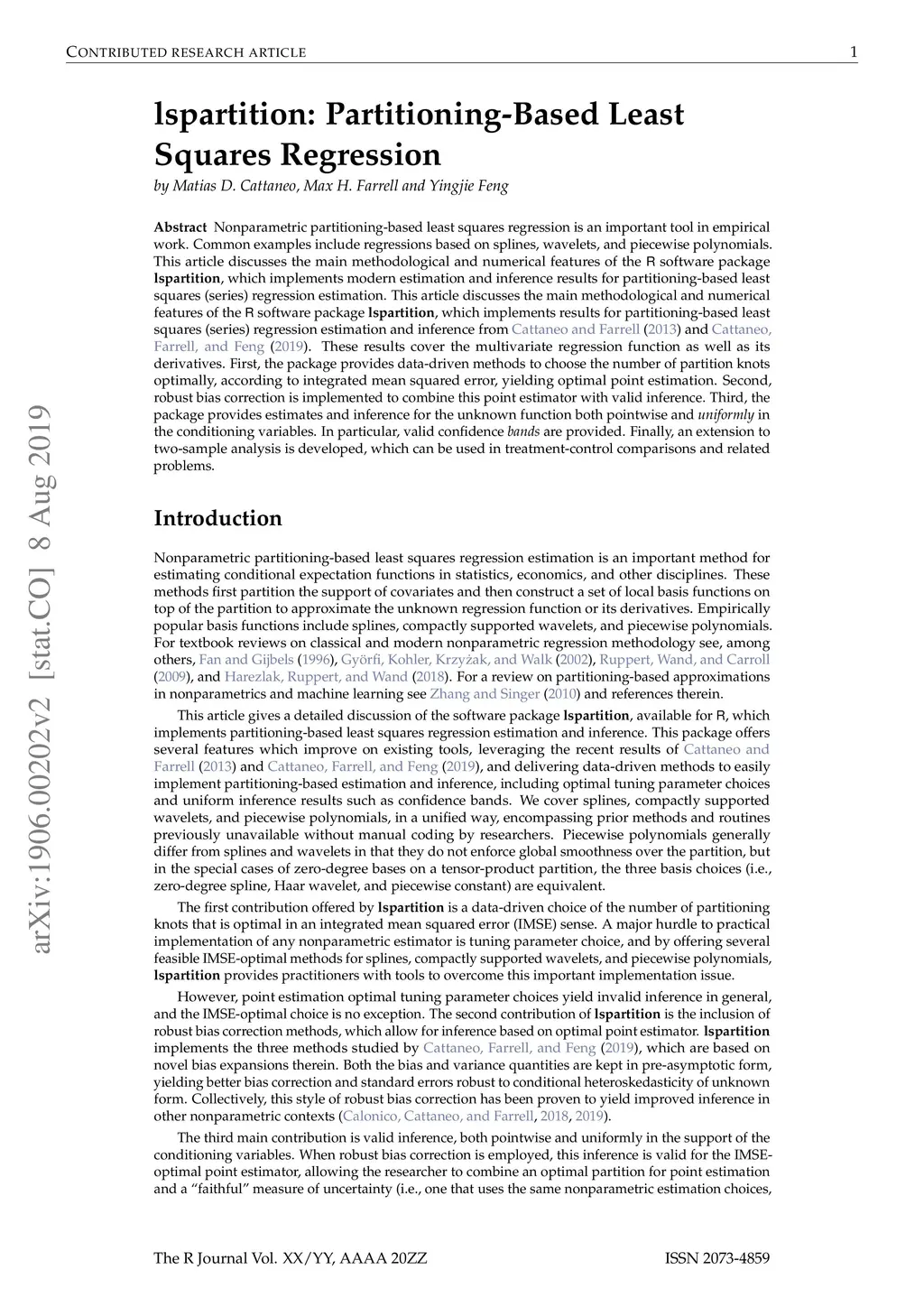 Nonparametric partitioning-based least squares regression is an important tool in empirical work. Common examples include regressions based on splines, wavelets, and piecewise polynomials. This article discusses the main methodological and numerical features of the R software package lspartition, which implements modern estimation and inference results for partitioning-based least squares (series) regression estimation. This article discusses the main methodological and numerical features of the R software package lspartition, which implements results for partitioning-based least squares (series) regression estimation and inference from Cattaneo and Farrell (2013) and Cattaneo, Farrell, and Feng (2019). These results cover the multivariate regression function as well as its derivatives. First, the package provides data-driven methods to choose the number of partition knots optimally, according to integrated mean squared error, yielding optimal point estimation. Second, robust bias correction is implemented to combine this point estimator with valid inference. Third, the package provides estimates and inference for the unknown function both pointwise and uniformly in the conditioning variables. In particular, valid confidence bands are provided. Finally, an extension to two-sample analysis is developed, which can be used in treatment-control comparisons and related problems