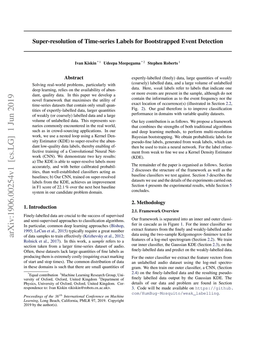 Solving real-world problems, particularly with deep learning, relies on the availability of abundant, quality data. In this paper we develop a novel framework that maximises the utility of time-series datasets that contain only small quantities of expertly-labelled data, larger quantities of weakly (or coarsely) labelled data and a large volume of unlabelled data. This represents scenarios commonly encountered in the real world, such as in crowd-sourcing applications. In our work, we use a nested loop using a Kernel Density Estimator (KDE) to super-resolve the abundant low-quality data labels, thereby enabling effective training of a Convolutional Neural Network (CNN). We demonstrate two key results: a) The KDE is able to super-resolve labels more accurately, and with better calibrated probabilities, than well-established classifiers acting as baselines; b) Our CNN, trained on super-resolved labels from the KDE, achieves an improvement in F1 score of 22.1% over the next best baseline system in our candidate problem domain.