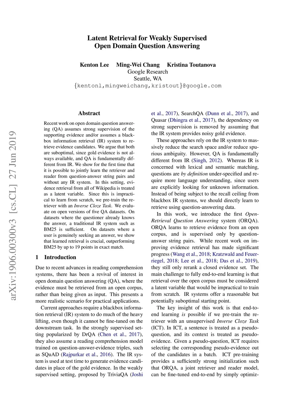 Latent Retrieval for Weakly Supervised Open Domain Question Answering