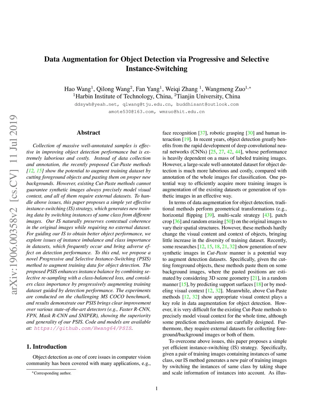 Collection of massive well-annotated samples is effective in improving object detection performance but is extremely laborious and costly. Instead of data collection and annotation, the recently proposed Cut-Paste methods [12, 15] show the potential to augment training dataset by cutting foreground objects and pasting them on proper new backgrounds. However, existing Cut-Paste methods cannot guarantee synthetic images always precisely model visual context, and all of them require external datasets. To handle above issues, this paper proposes a simple yet effective instance-switching (IS) strategy, which generates new training data by switching instances of same class from different images. Our IS naturally preserves contextual coherence in the original images while requiring no external dataset. For guiding our IS to obtain better object performance, we explore issues of instance imbalance and class importance in datasets, which frequently occur and bring adverse effect on detection performance. To this end, we propose a novel Progressive and Selective Instance-Switching (PSIS) method to augment training data for object detection. The proposed PSIS enhances instance balance by combining selective re-sampling with a class-balanced loss, and considers class importance by progressively augmenting training dataset guided by detection performance. The experiments are conducted on the challenging MS COCO benchmark, and results demonstrate our PSIS brings clear improvement over various state-of-the-art detectors (e.g., Faster R-CNN, FPN, Mask R-CNN and SNIPER), showing the superiority and generality of our PSIS. Code and models are available at: https://github.com/Hwang64/PSIS.