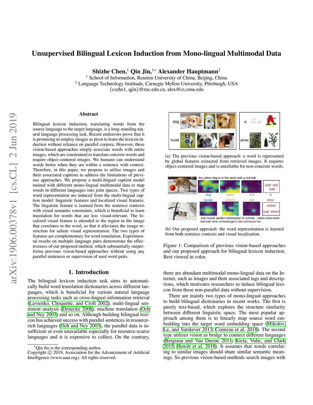 Bilingual lexicon induction, translating words from the source language to the target language, is a long-standing natural language processing task. Recent endeavors prove that it is promising to employ images as pivot to learn the lexicon induction without reliance on parallel corpora. However, these vision-based approaches simply associate words with entire images, which are constrained to translate concrete words and require object-centered images. We humans can understand words better when they are within a sentence with context. Therefore, in this paper, we propose to utilize images and their associated captions to address the limitations of previous approaches. We propose a multi-lingual caption model trained with different mono-lingual multimodal data to map words in different languages into joint spaces. Two types of word representation are induced from the multi-lingual caption model: linguistic features and localized visual features. The linguistic feature is learned from the sentence contexts with visual semantic constraints, which is beneficial to learn translation for words that are less visual-relevant. The localized visual feature is attended to the region in the image that correlates to the word, so that it alleviates the image restriction for salient visual representation. The two types of features are complementary for word translation. Experimental results on multiple language pairs demonstrate the effectiveness of our proposed method, which substantially outperforms previous vision-based approaches without using any parallel sentences or supervision of seed word pairs.